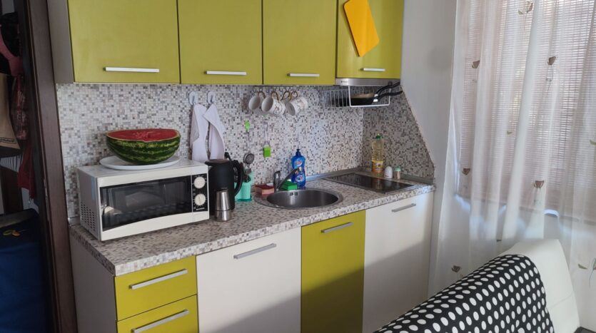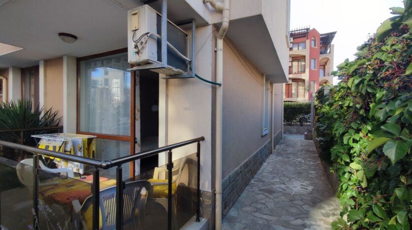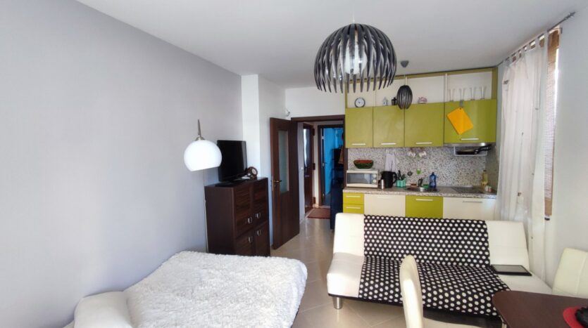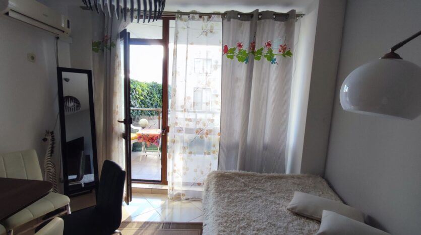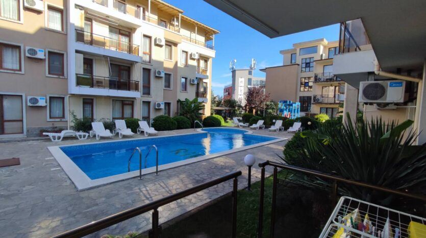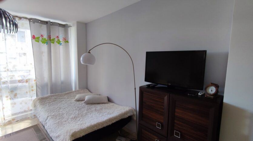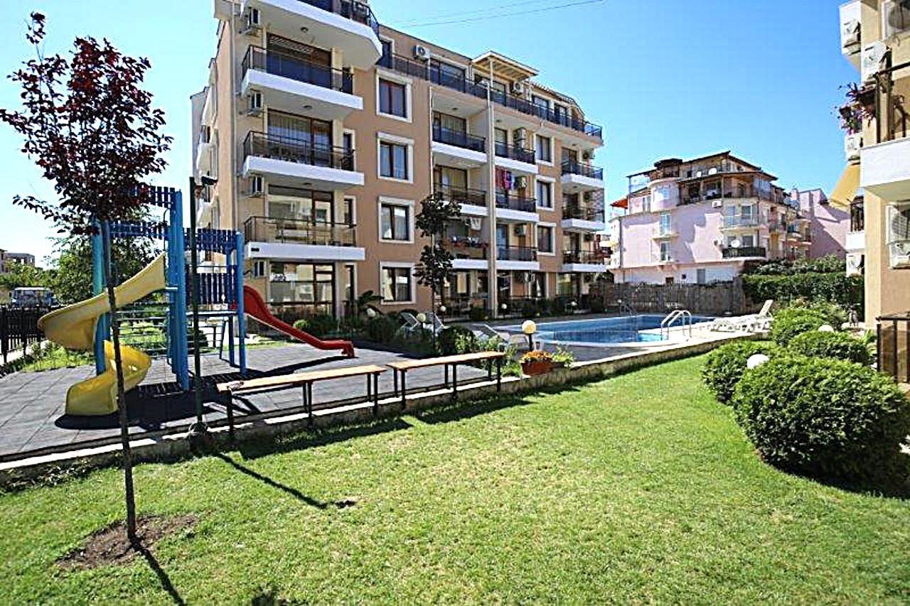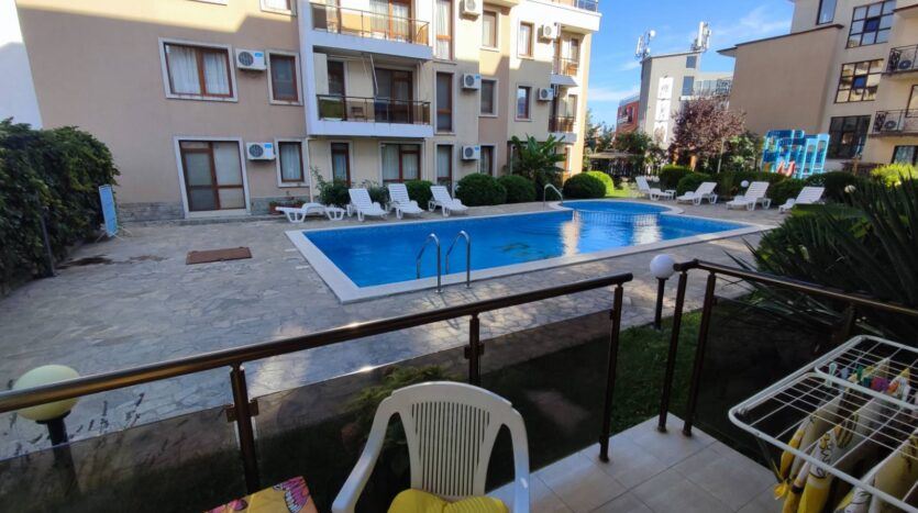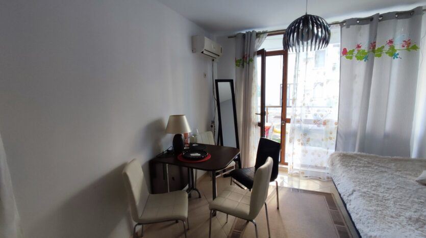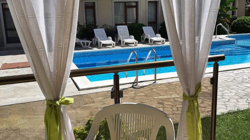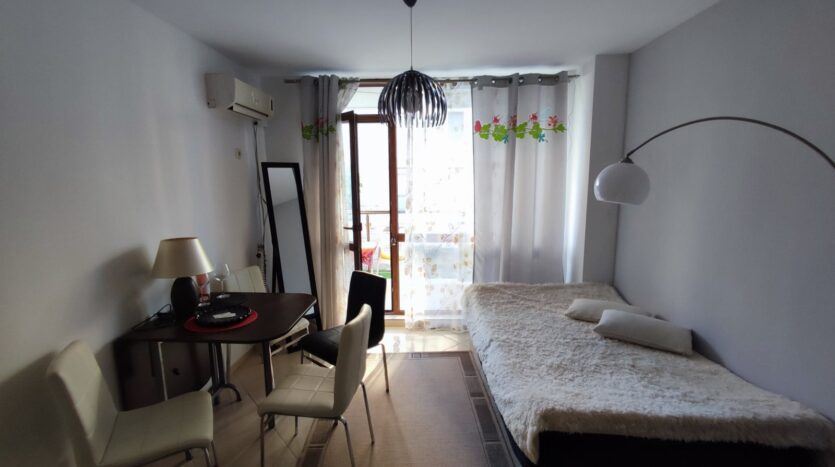 One-bedroom fully furnished and equipped apartment in the resort town of Ravda. The small and cozy complex consists of two residential buildings located on a common area with rich landscaping, swimming pool, playground, benches and parking. The complex consists of only 35 flats of various sizes. The flat we offer for sale consists of an entrance hall, living room with kitchenette, bedroom, bathroom with WC and a terrace. The apartment is fully finished and ready to move in. It is a quiet place with a good beach suitable for people of all ages, especially popular for families with children