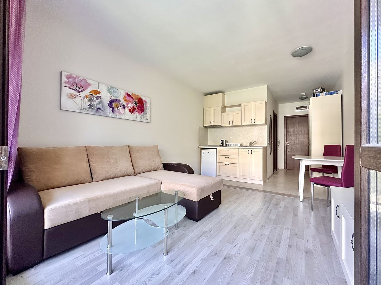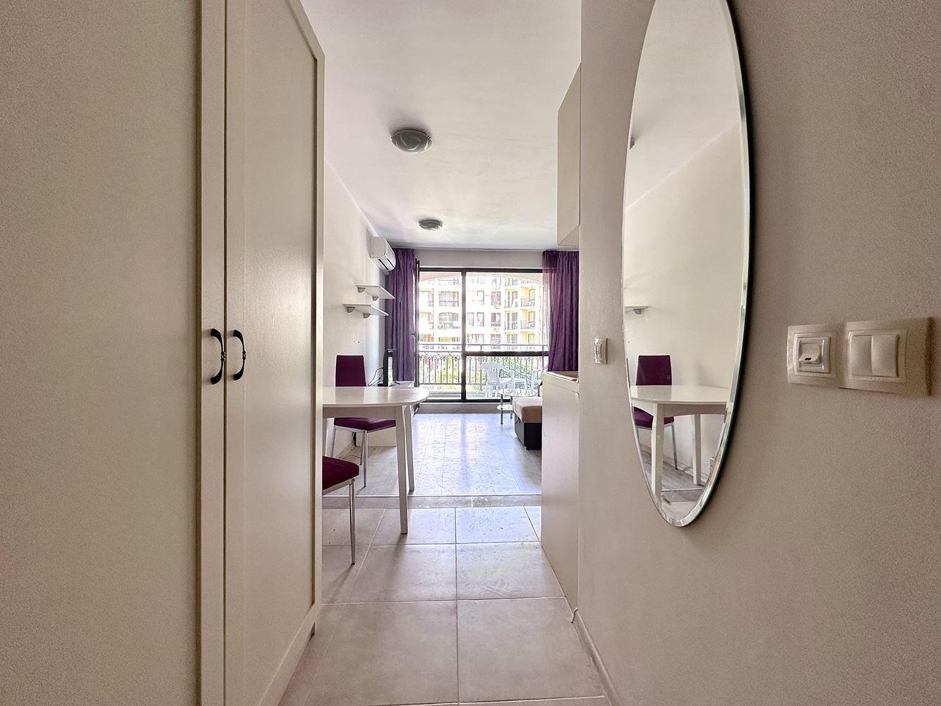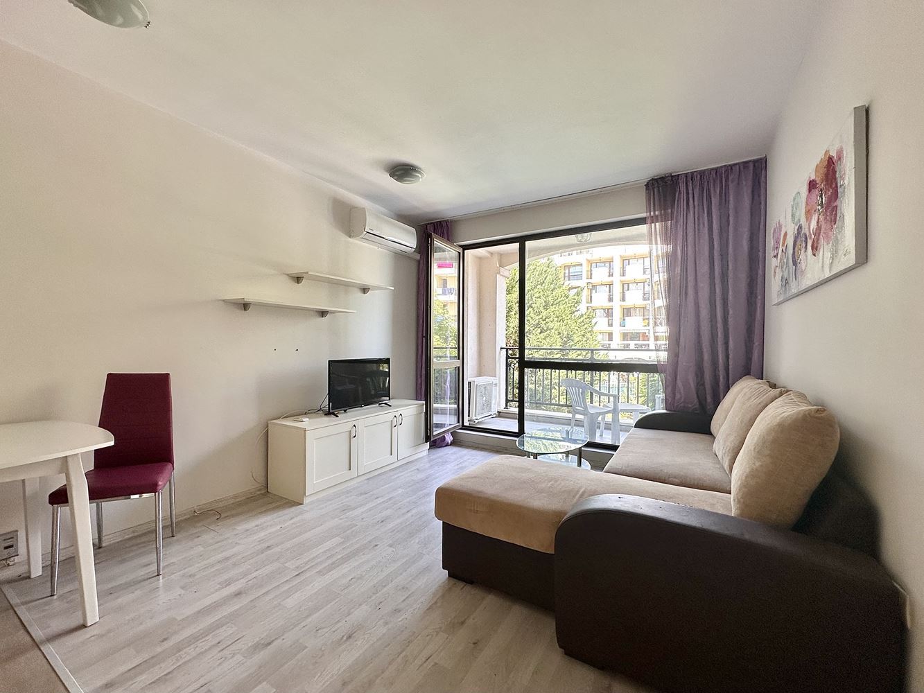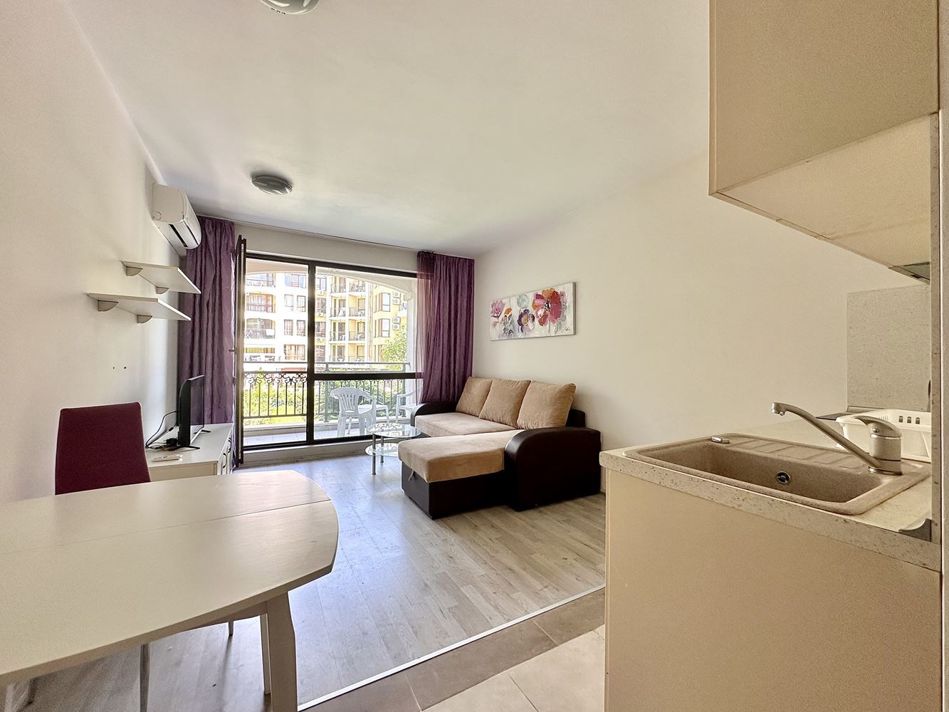 We are selling a beautifully furnished studio in Sunny Beach resort, which offers the ideal combination of comfort and convenience. With a total area of 39,56 m2, this property is located in a complex with Act 16 and allows year-round use. The studio consists of a spacious entrance hall leading to a bathroom equipped with modern amenities such as a boiler and washing machine. The main room combines a comfortable living room with a functional kitchen, creating a cosy space for living and relaxing. From your balcony you can enjoy the magnificent view of the pool, the place is furnished with garden furniture, ideal for outdoor relaxation.