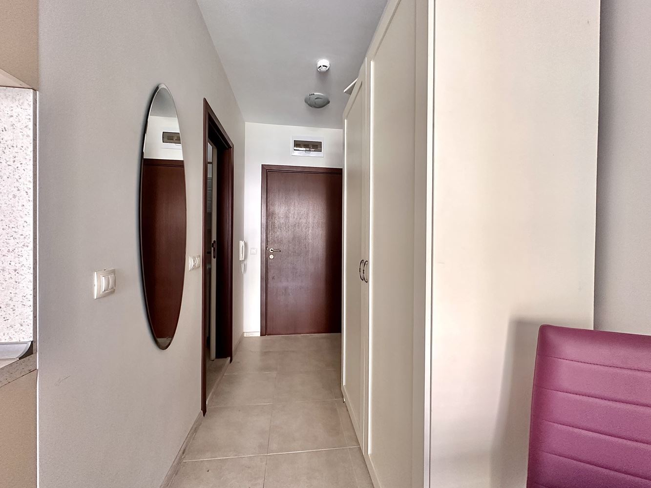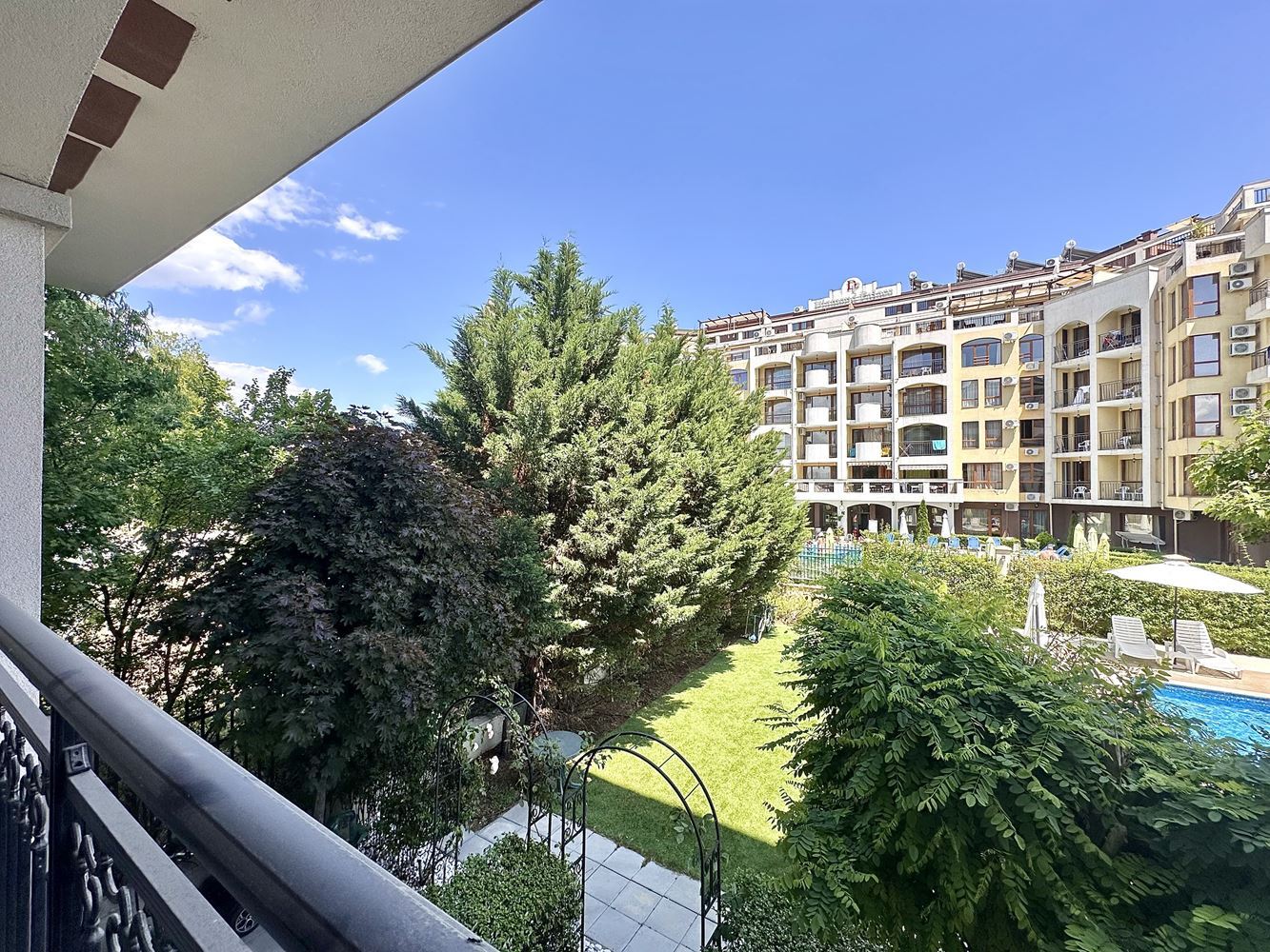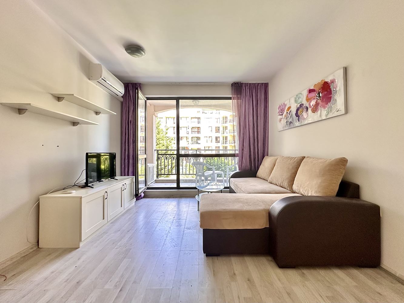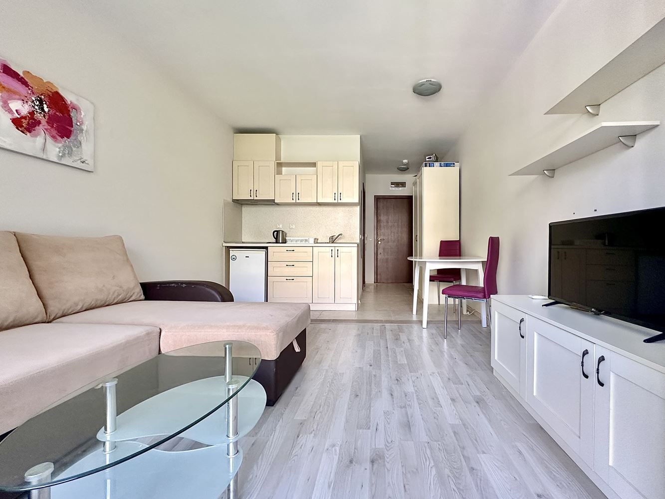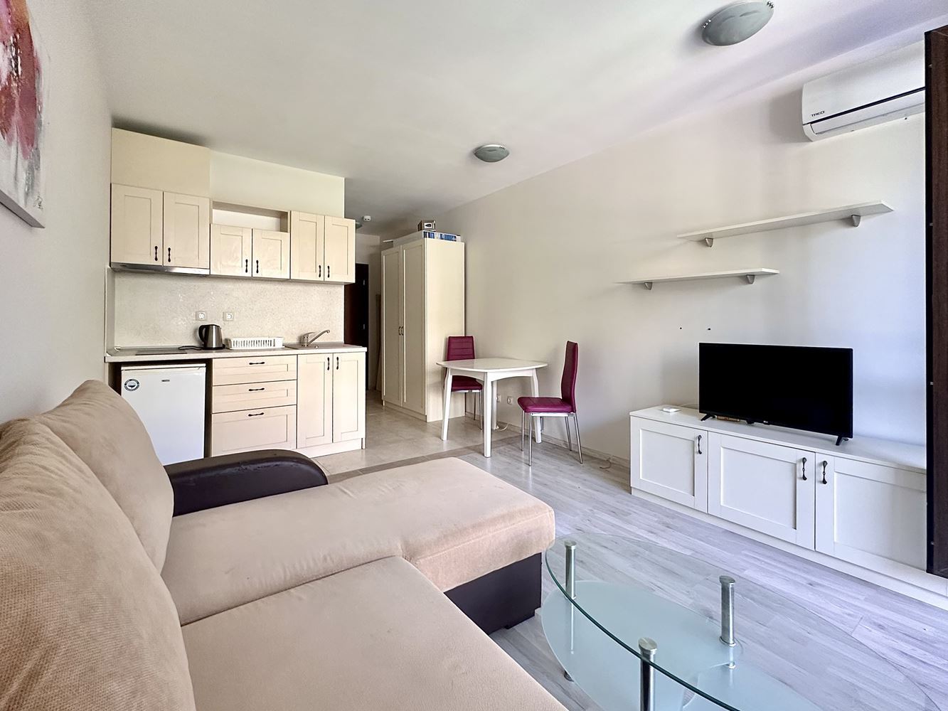 We are selling a beautifully furnished studio in Sunny Beach resort, which offers the ideal combination of comfort and convenience. With a total area of 39,56 m2, this property is located in a complex with Act 16 and allows year-round use. The studio consists of a spacious entrance hall leading to a bathroom equipped with modern amenities such as a boiler and washing machine. The main room combines a comfortable living room with a functional kitchen, creating a cosy space for living and relaxing. From your balcony you can enjoy the magnificent view of the pool, the place is furnished with garden furniture, ideal for outdoor relaxation.