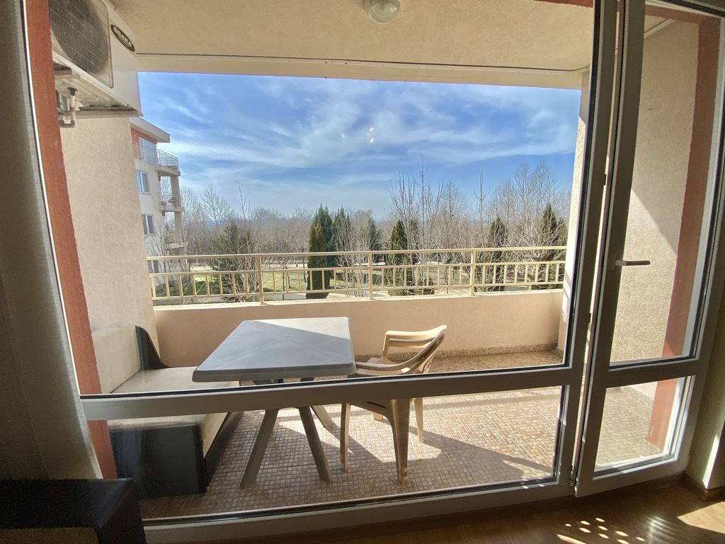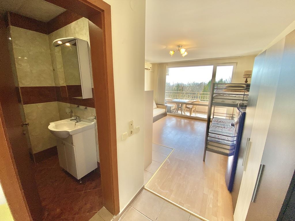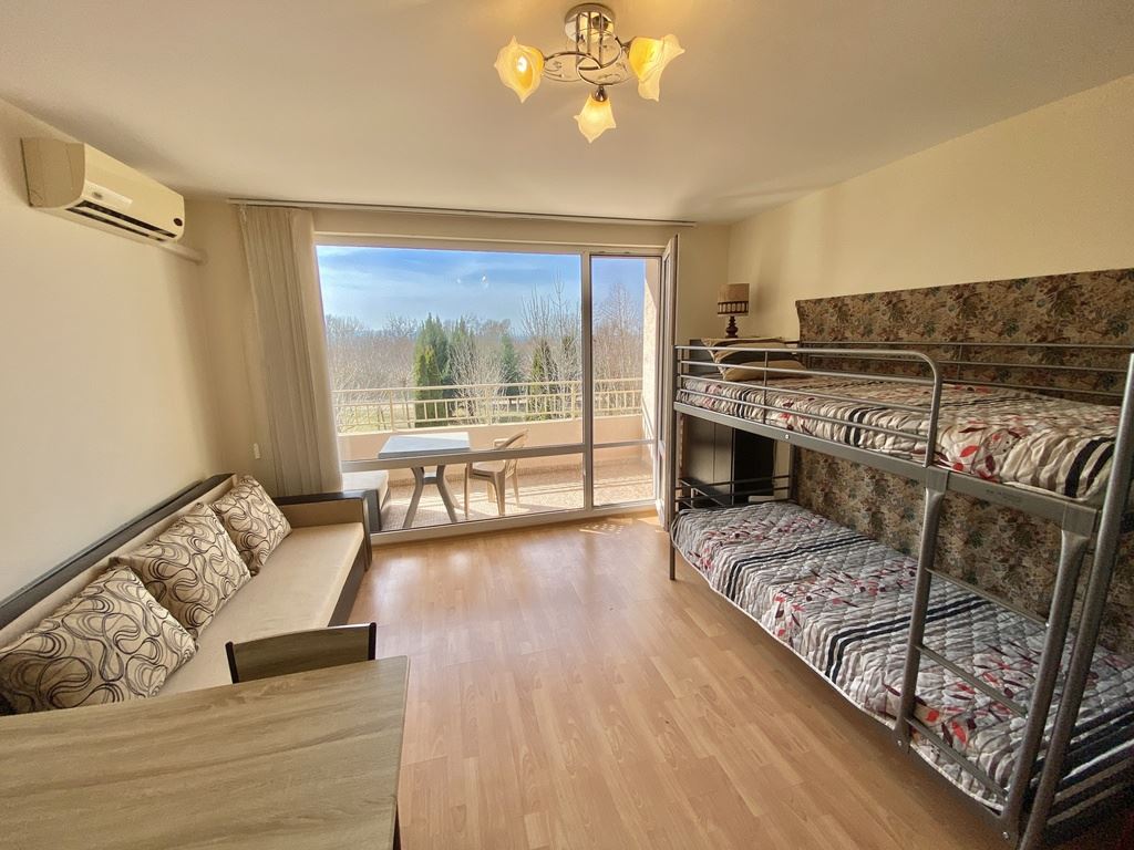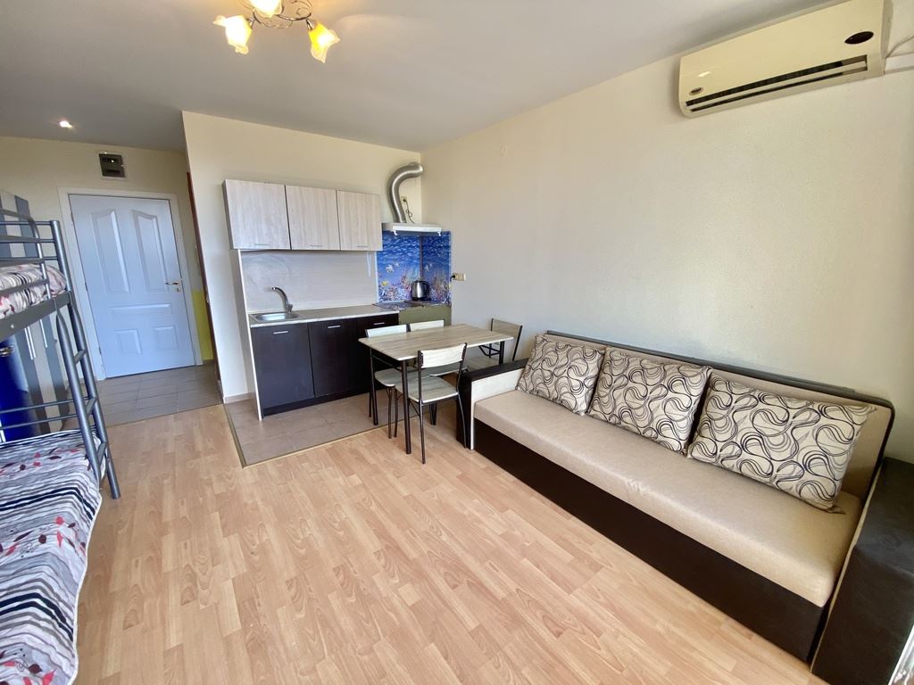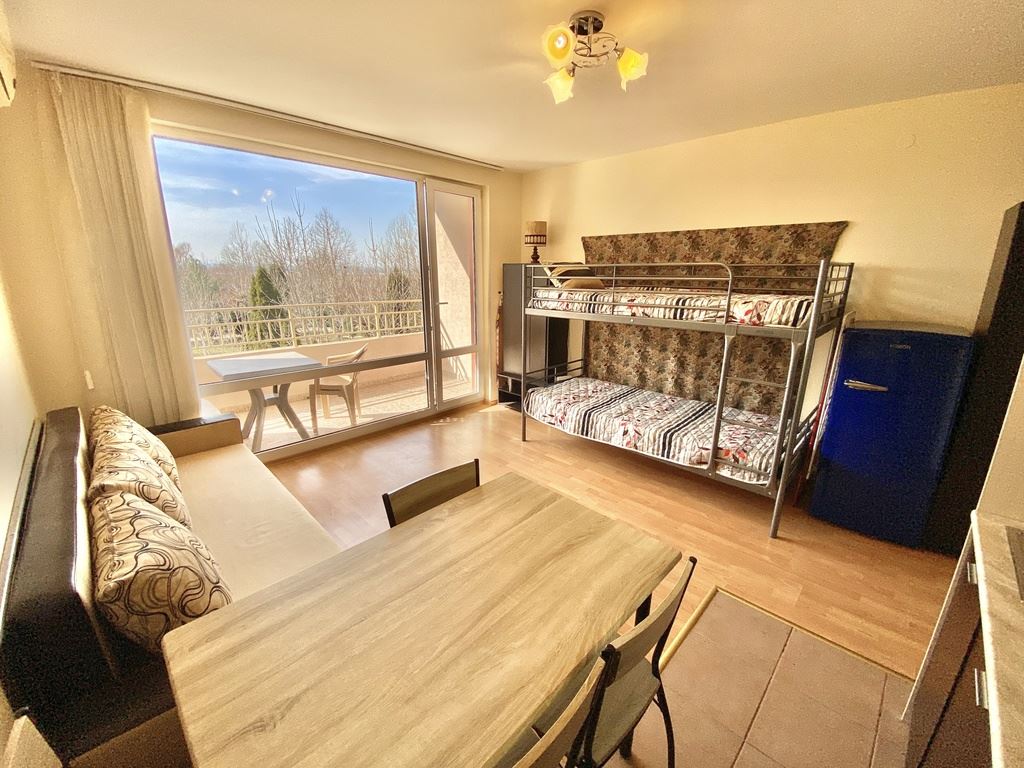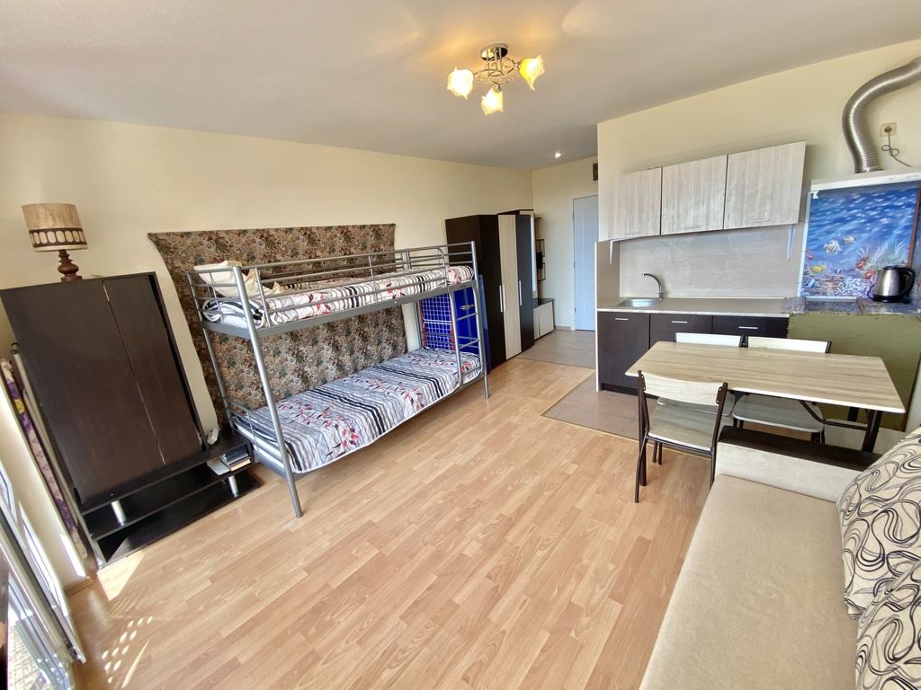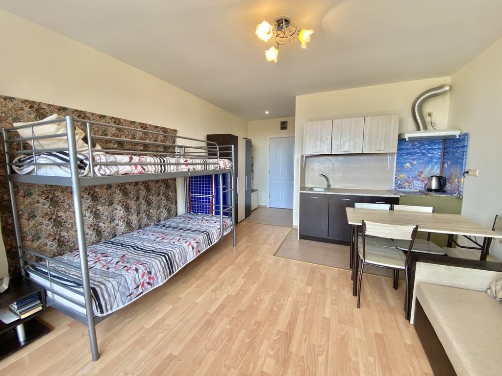 We present to you a cozy studio with a total area of 40 m² (living area 35 m²), located on the second floor in one of the most sought-after complexes on the Bulgarian Black Sea coast. The apartment is fully furnished and equipped with household appliances, ready for immediate use. With a west-facing orientation, the studio offers a beautiful view of the mountains and fields, providing peace and relaxation after a busy day. The complex’s location is extremely convenient – the sea is only a 10–12 minute walk, and the beach is 70 m wide, perfect for family walks, beach sports, and sunny days.