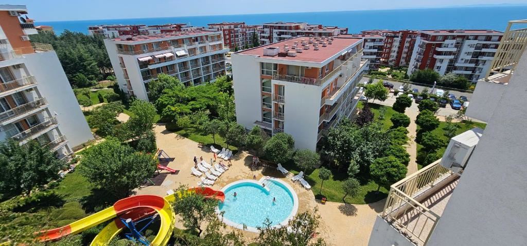The complex in which the property is located offers unmatched amenities for your peace of mind and entertainment. There are 18 swimming pools, some of which offer the unique experience of artificial waves. Guests and owners can use the umbrellas and sun loungers by the pools free of charge. For those who enjoy an active lifestyle, the complex has an outdoor fitness center and a tennis court. If you prefer relaxation and rejuvenation, the spa center with a sauna, hydro-massage bath, and massages will offer you the best conditions. Children will have fun in the specially designed playroom, while adults can enjoy culinary delights in the three restaurants and bar. 24-hour security and maintenance are provided for your safety and comfort.