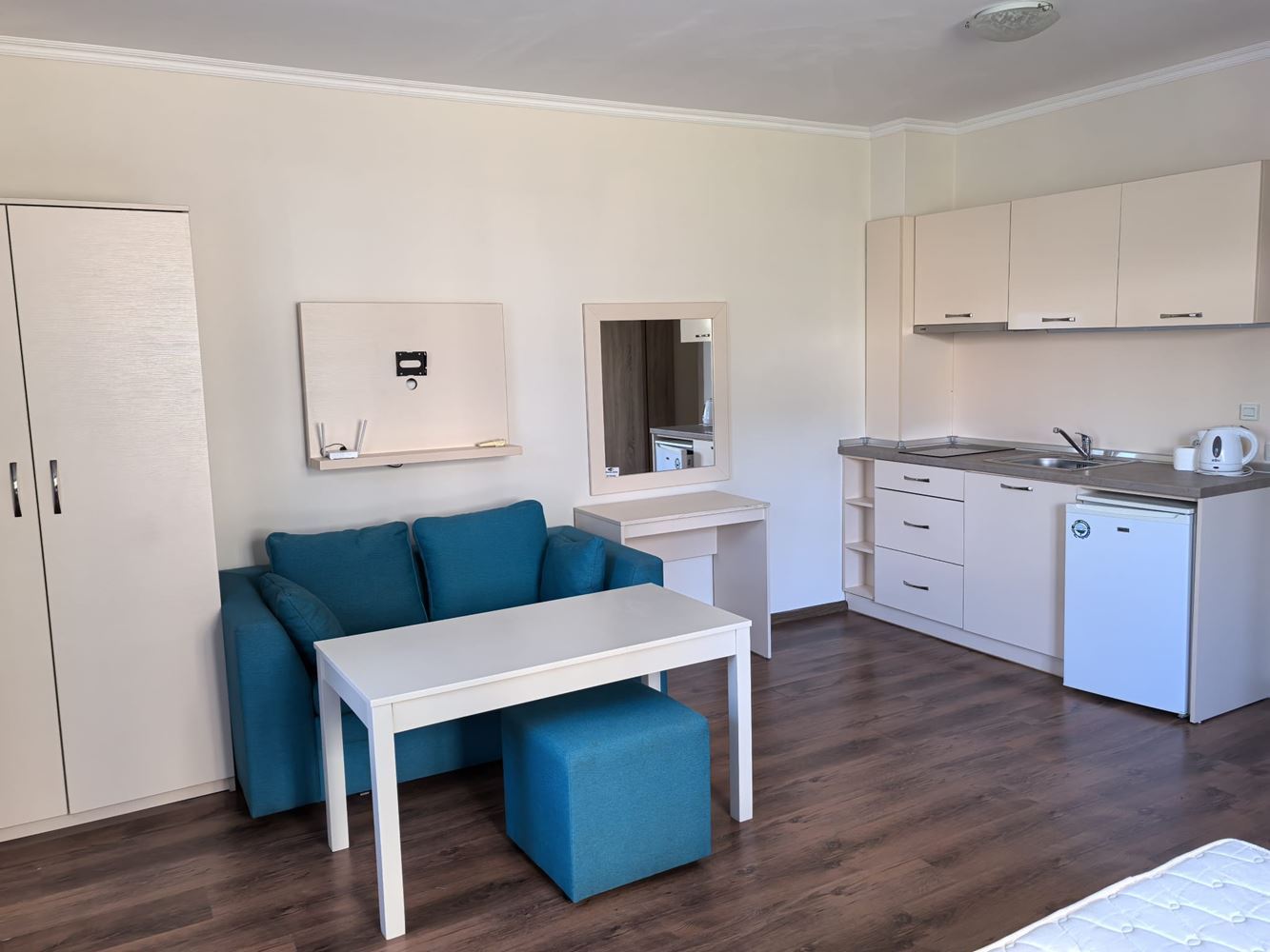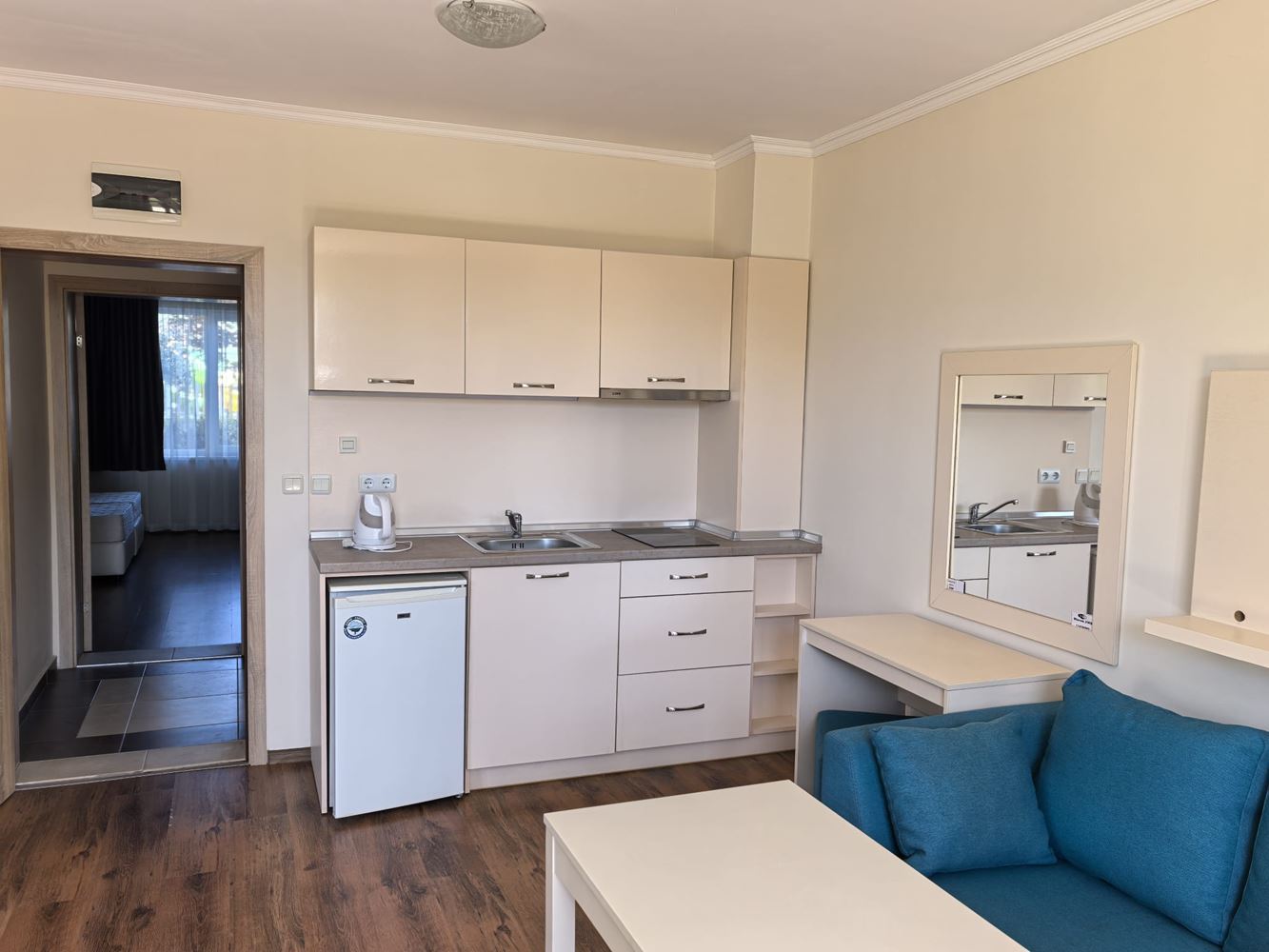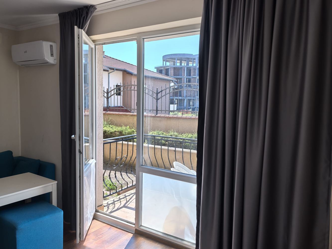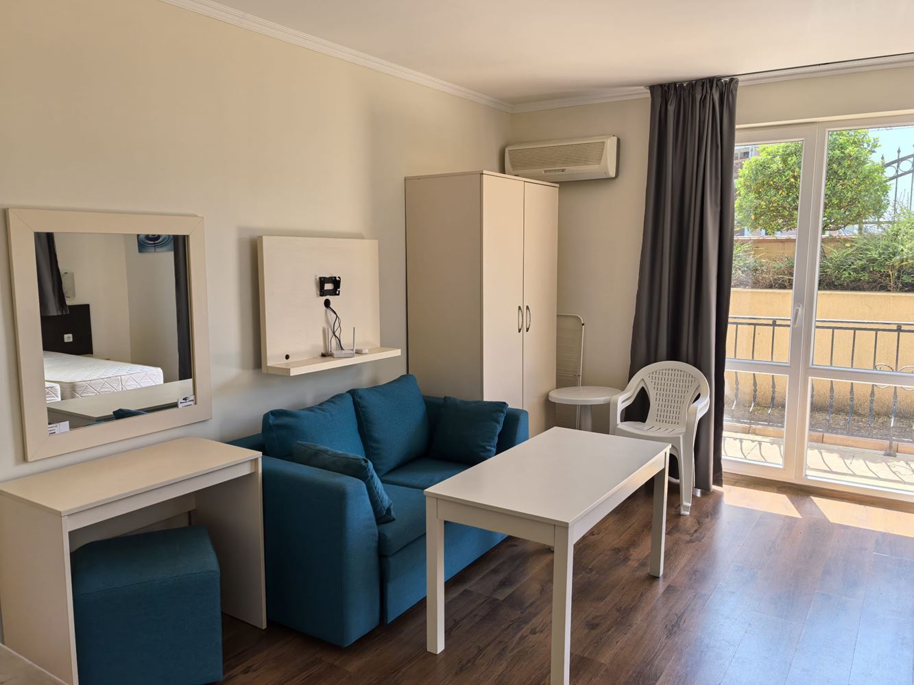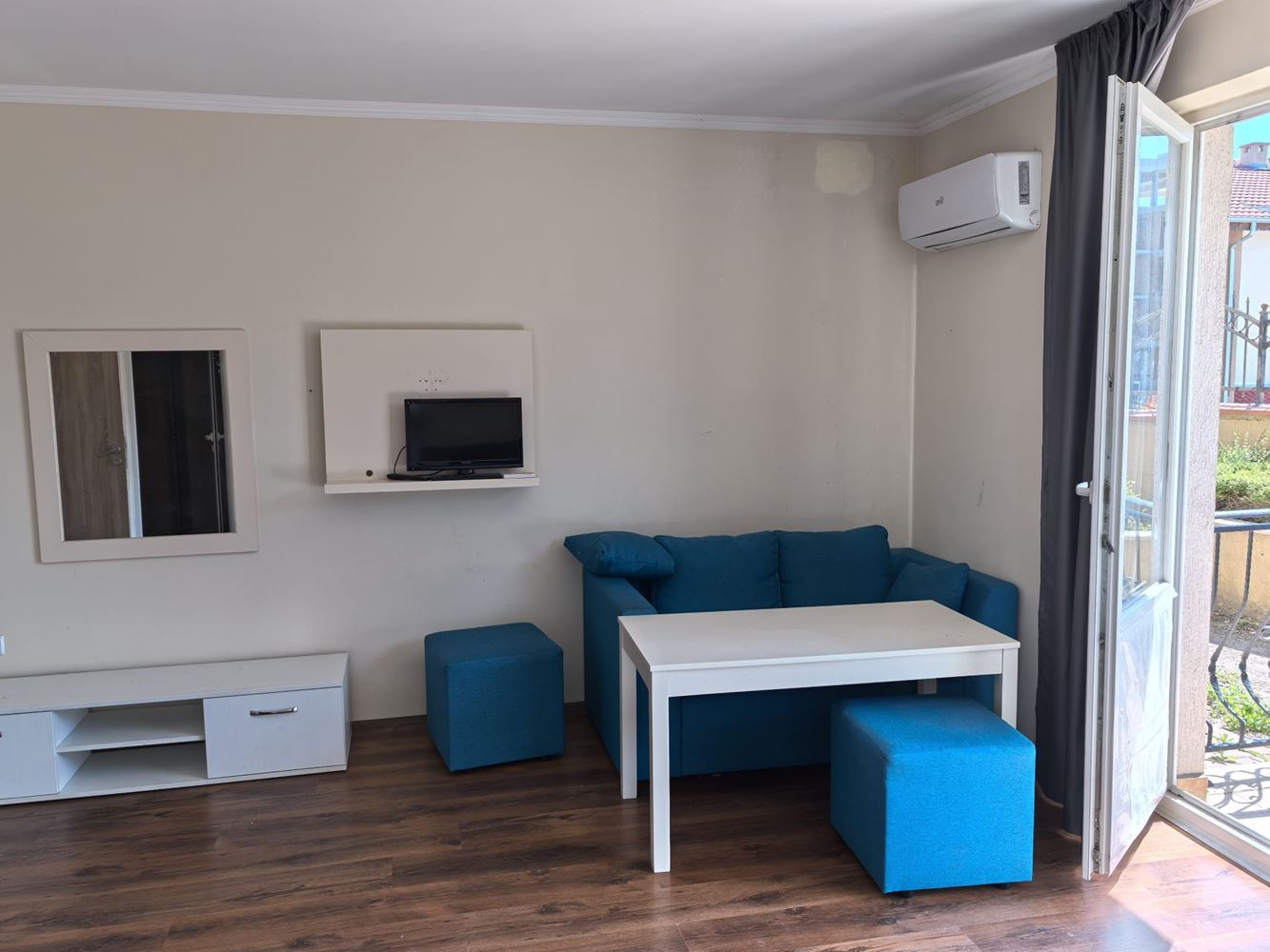 Fully furnished spacious studio 700 m from the sea is located in a popular spa complex in Sveti Vlas. The apartment has a total area of 41 m2 on the ground floor, overlooking the courtyard. Layout includes entrance hall, large living room with kitchenette and relaxation area, bathroom, terrace. The apartment is fully furnished.