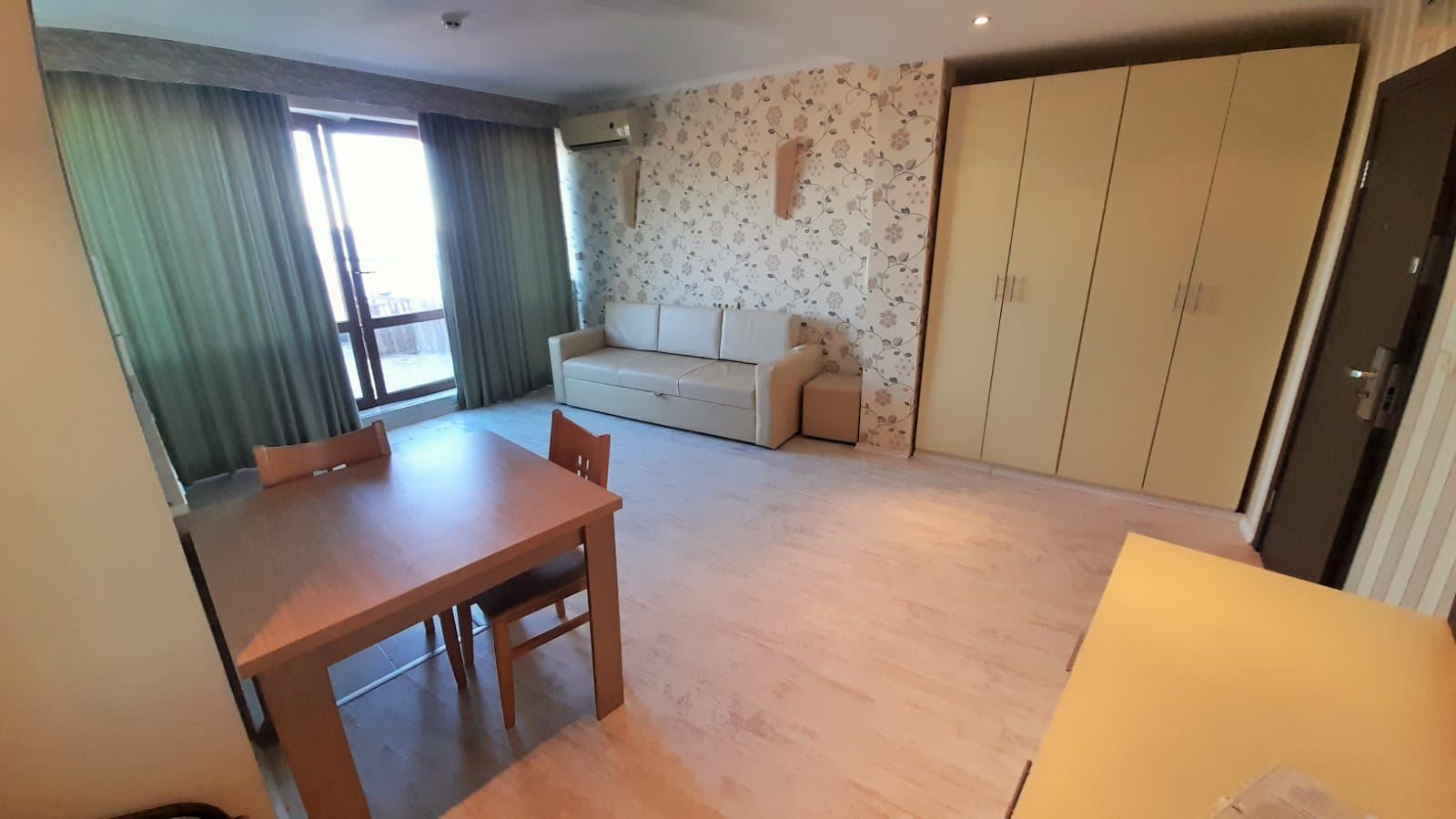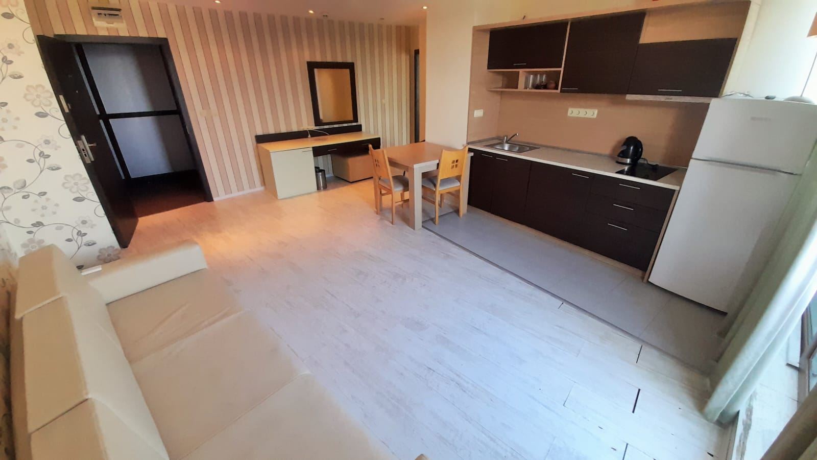 The apartment features a functional layout and is ready for immediate occupancy. It consists of a spacious entrance hall, a bright living room with kitchenette and comfortable lounge area, a cozy bedroom, an elegant bathroom with shower and bathtub, and a sunny balcony – perfect for morning coffee, sunsets, and complete relaxation. The apartment is fully furnished with high-quality furniture and equipped with all necessary appliances, ensuring effortless daily living and a luxurious feel.