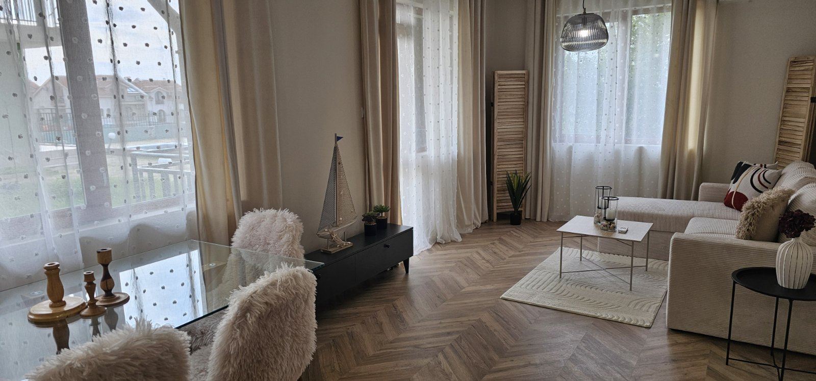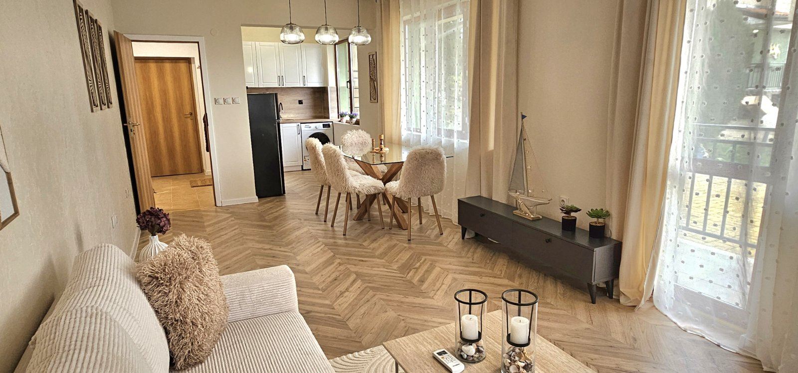 We offer for sale a stylish three-room apartment on a high ground floor in Sunny Beach, with a total area of 87 m², fully renovated by a designer and ready to move in. The property comes with no maintenance fee, has Act 16, and separate electricity and water accounts – an excellent choice both for year-round living and investment.
