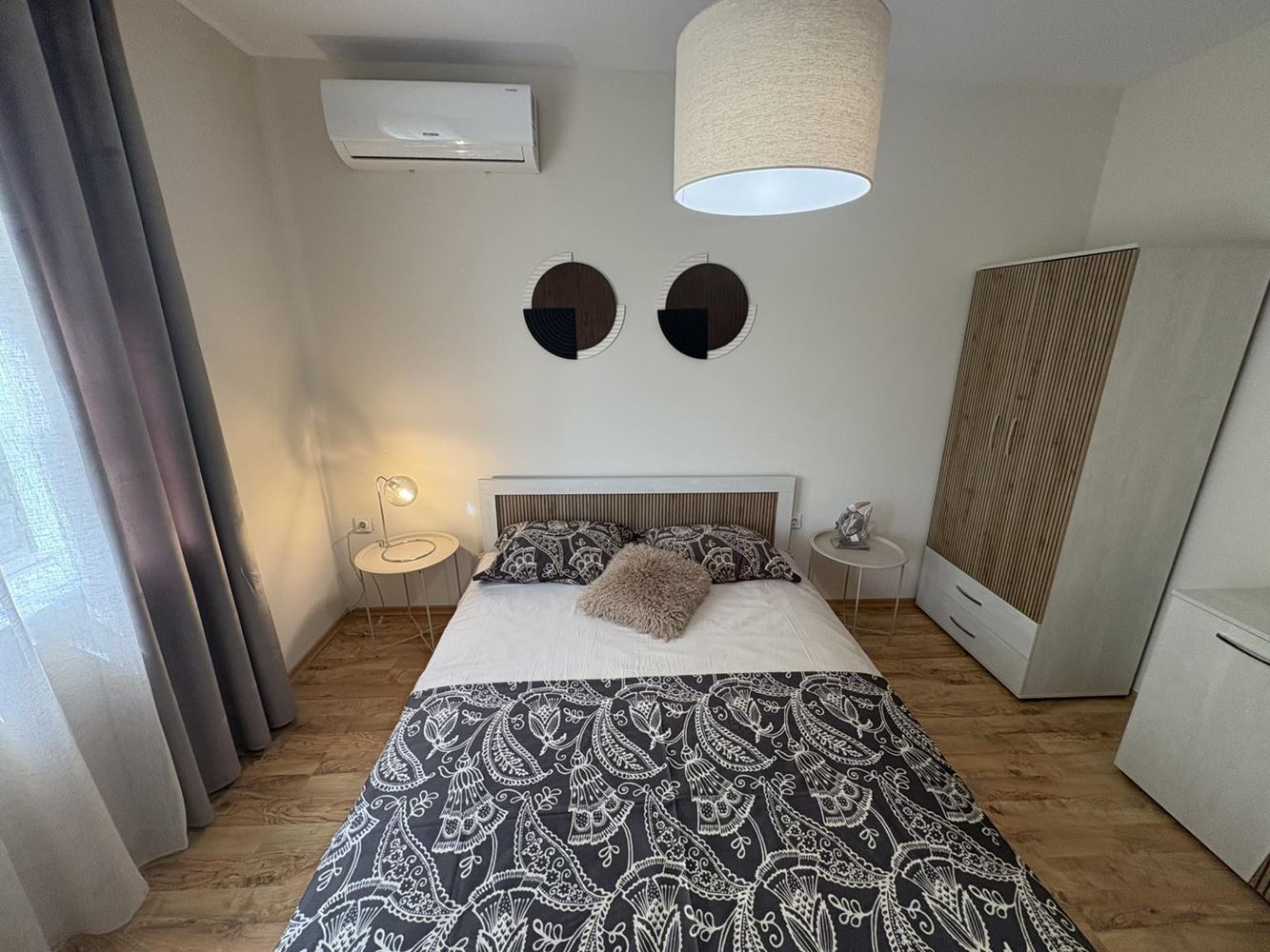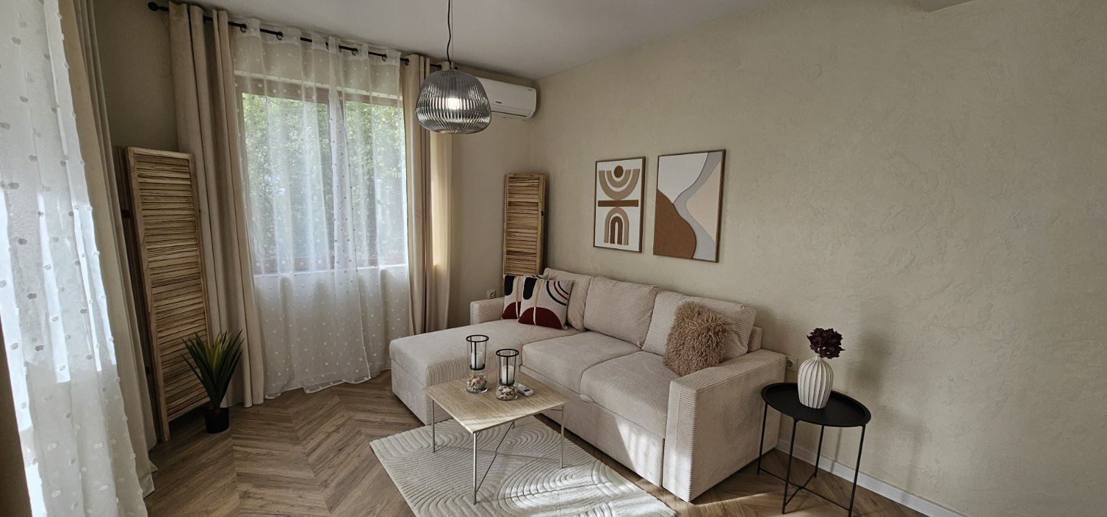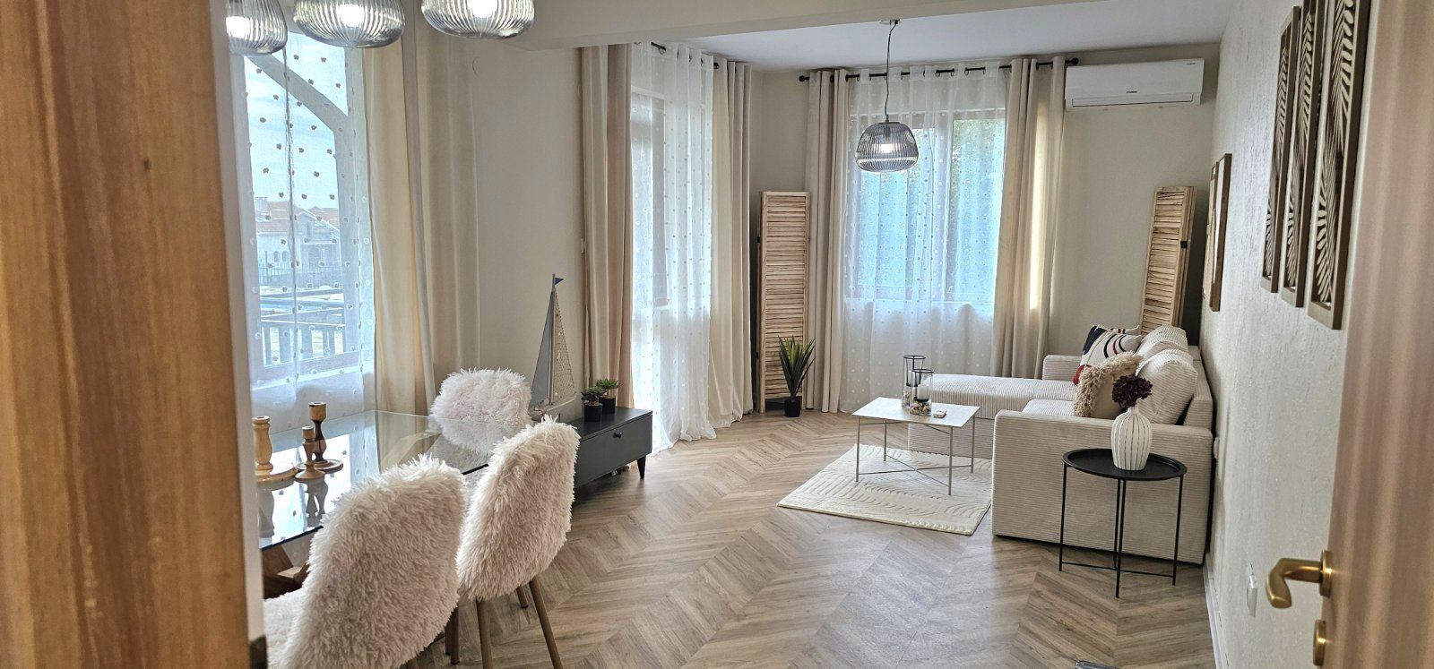 The apartment is fully furnished with brand-new furniture. The kitchen is new and equipped with built-in appliances under warranty. All main rooms feature new inverter air conditioners, also under warranty, providing energy-efficient heating and cooling. Modern materials, refined details, and a harmonious color palette create a contemporary and cozy atmosphere.