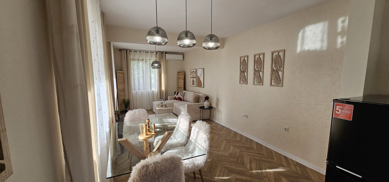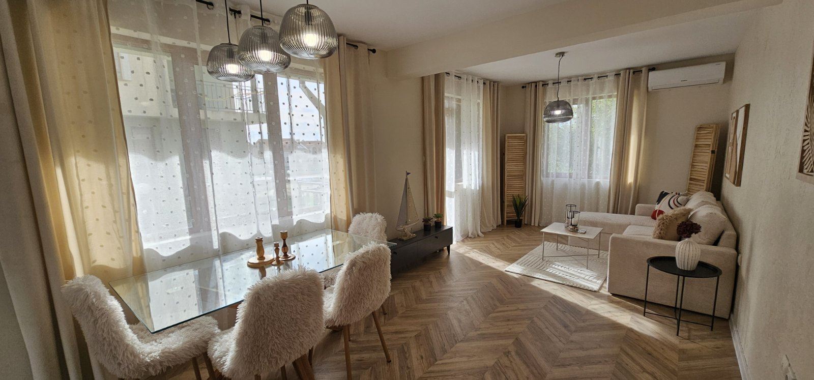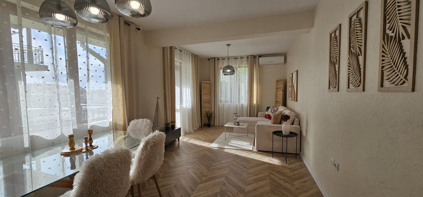 The apartment is fully furnished with brand-new furniture. The kitchen is new and equipped with built-in appliances under warranty. All main rooms feature new inverter air conditioners, also under warranty, providing energy-efficient heating and cooling. Modern materials, refined details, and a harmonious color palette create a contemporary and cozy atmosphere.