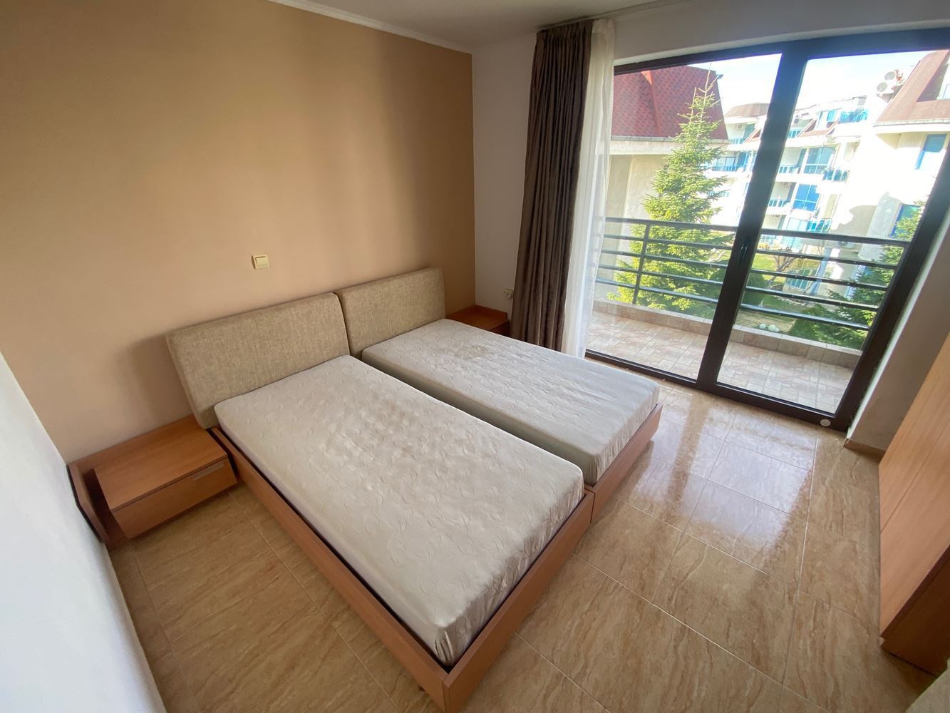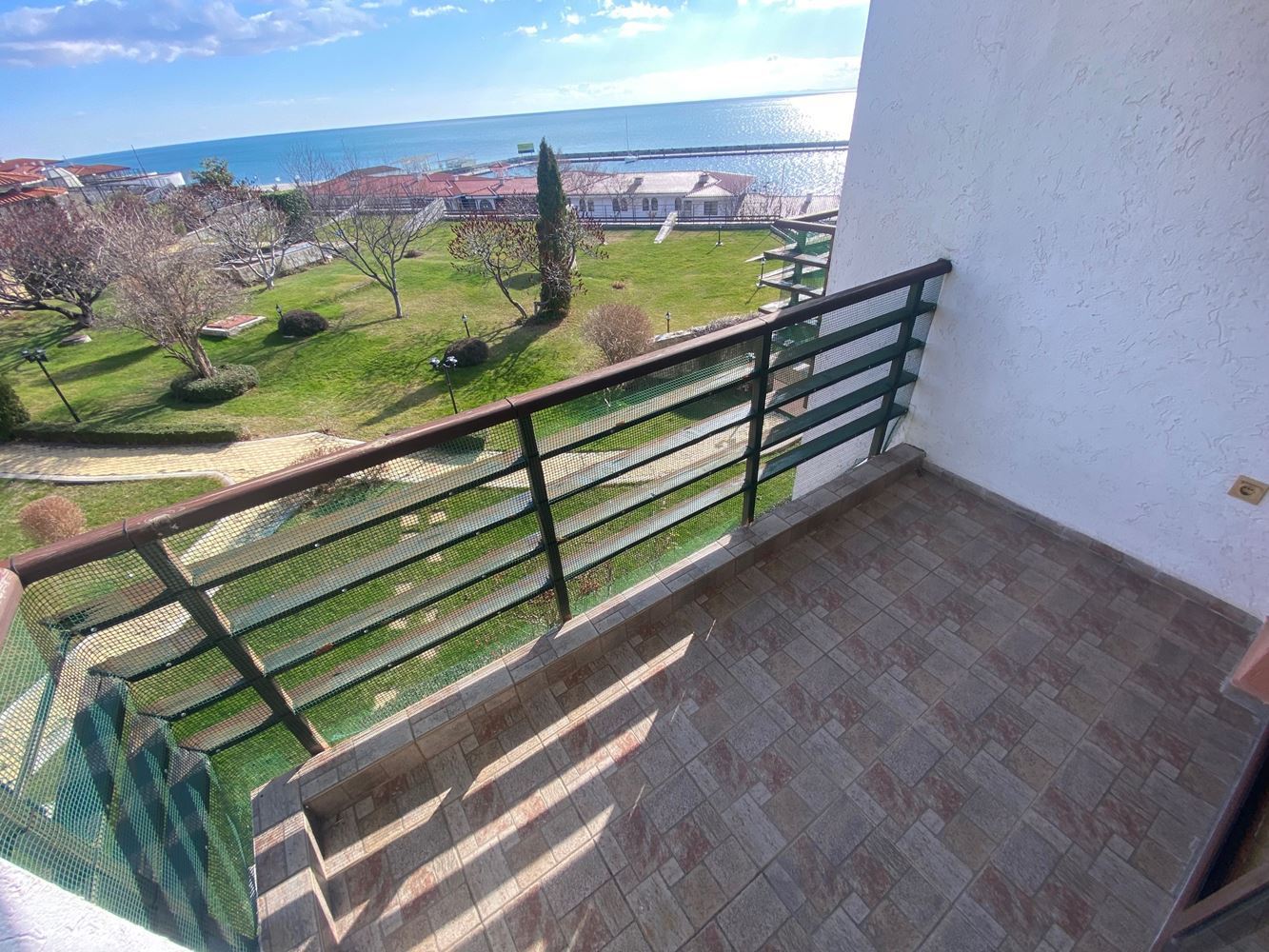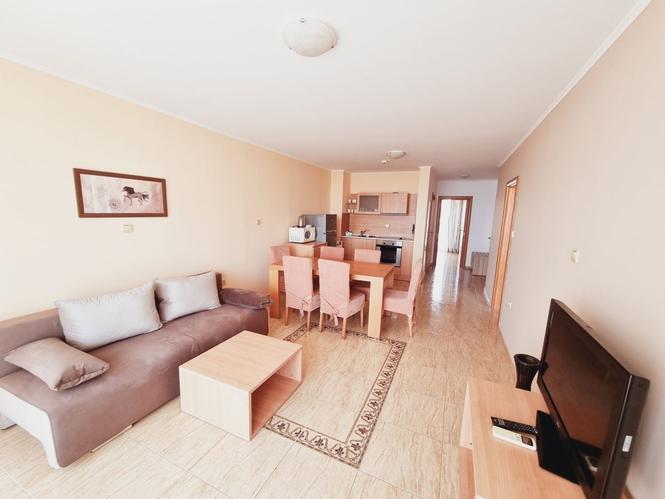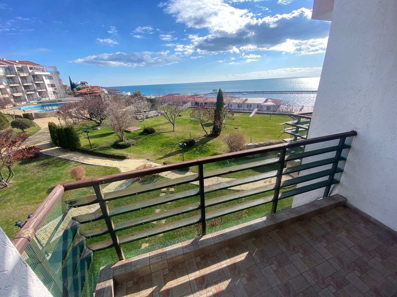 Two-bedroom first line apartament with sea view in a luxury complex in St. Vlas. The complex is located on the beachfront and is within walking distance of the spa centre, night club, shop, restaurant and theatre. Flat with an area of 95 m2 is located on the third floor. It is sold fully furnished. A beauty salon with solarium, karaoke, fitness centre, restaurant, outdoor pool, cafe, children swimming pool, bar, permanent security and maintenance, children playground. The flat has a good layout, including a hall with kitchen area, two bedrooms, two bathrooms and two balconies. Ideal for couples with children. The complex has two swimming pools, aqua bar, fitness room, internet room, beauty salon with sauna, hairdresser, supermarket, exchange office, piano bar, parking.