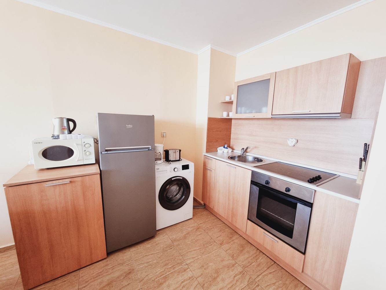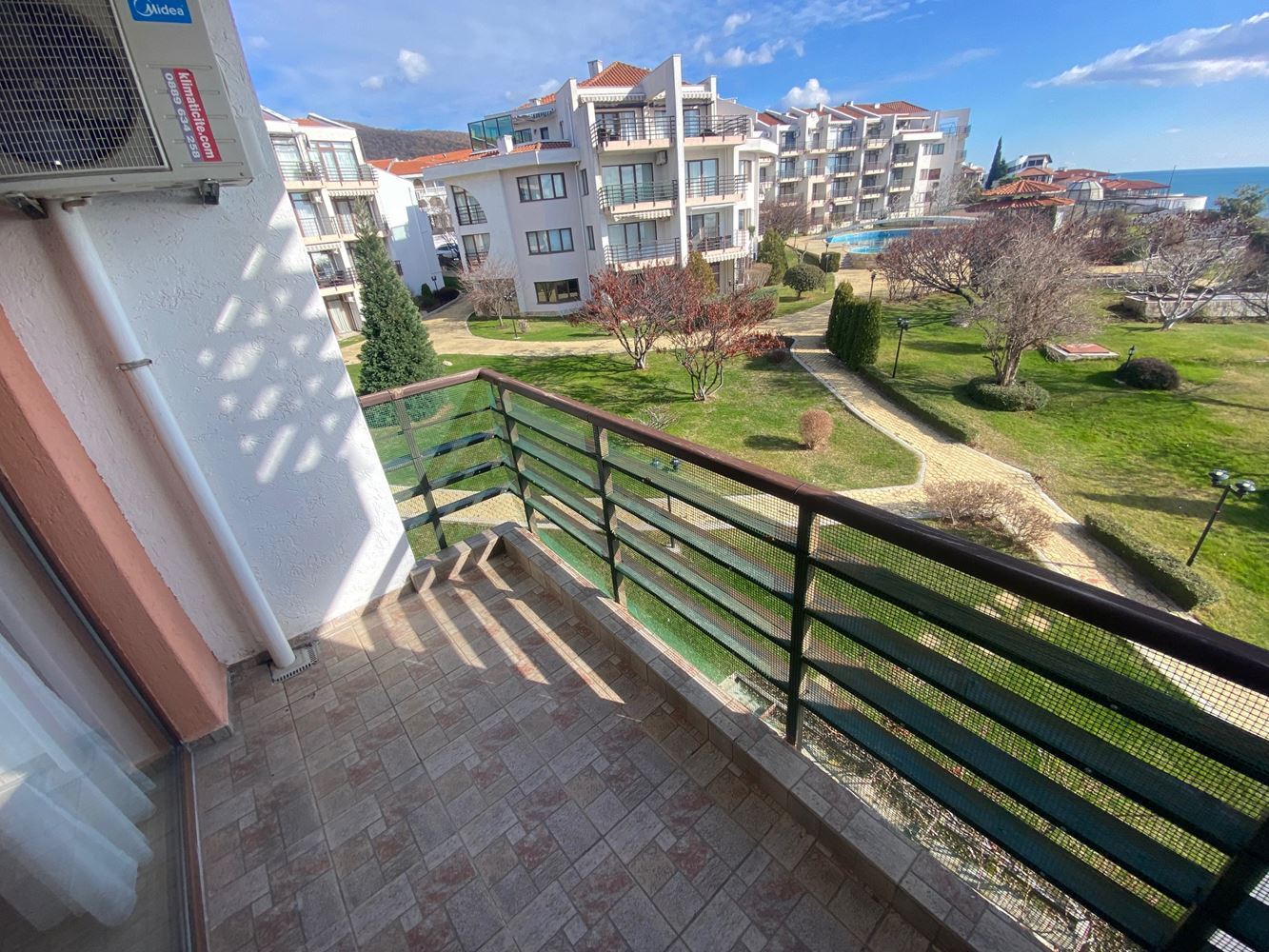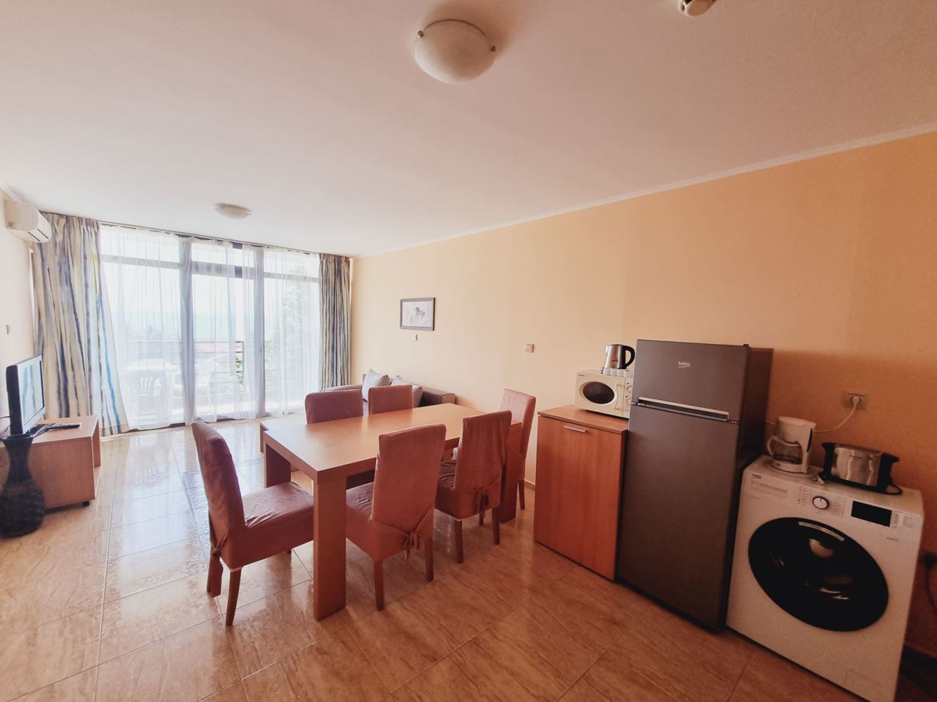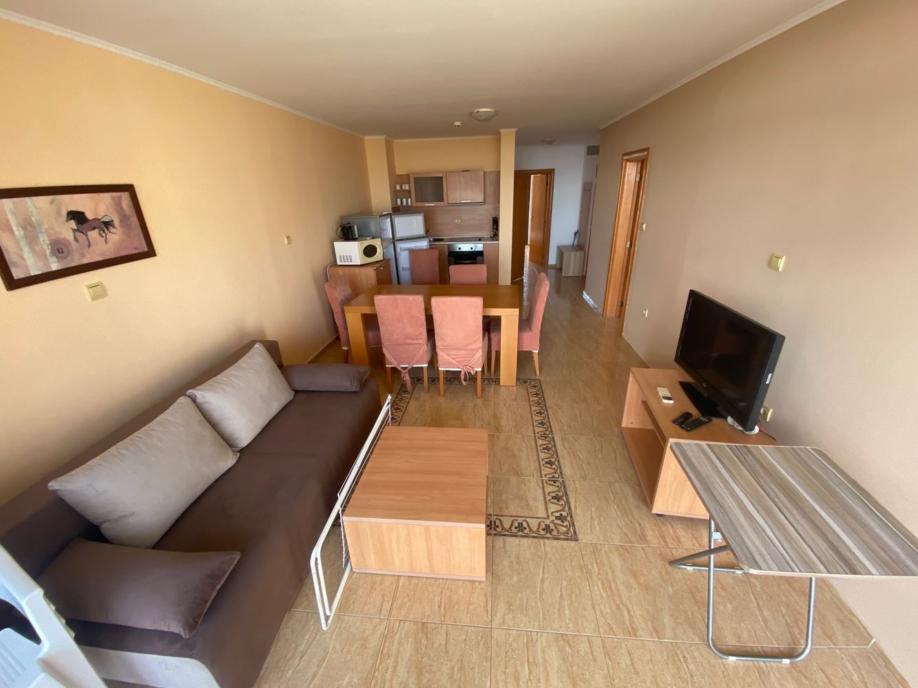 Two-bedroom first line apartament with sea view in a luxury complex in St. Vlas. The complex is located on the beachfront and is within walking distance of the spa centre, night club, shop, restaurant and theatre. Flat with an area of 95 m2 is located on the third floor. It is sold fully furnished. A beauty salon with solarium, karaoke, fitness centre, restaurant, outdoor pool, cafe, children swimming pool, bar, permanent security and maintenance, children playground. The flat has a good layout, including a hall with kitchen area, two bedrooms, two bathrooms and two balconies. Ideal for couples with children. The complex has two swimming pools, aqua bar, fitness room, internet room, beauty salon with sauna, hairdresser, supermarket, exchange office, piano bar, parking.