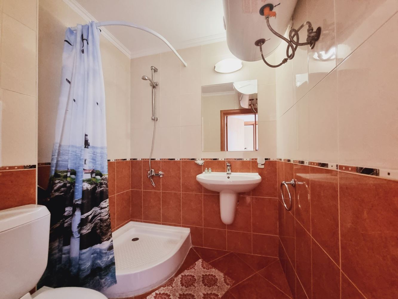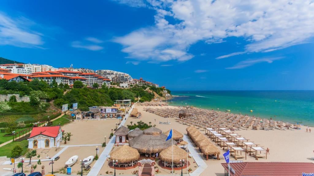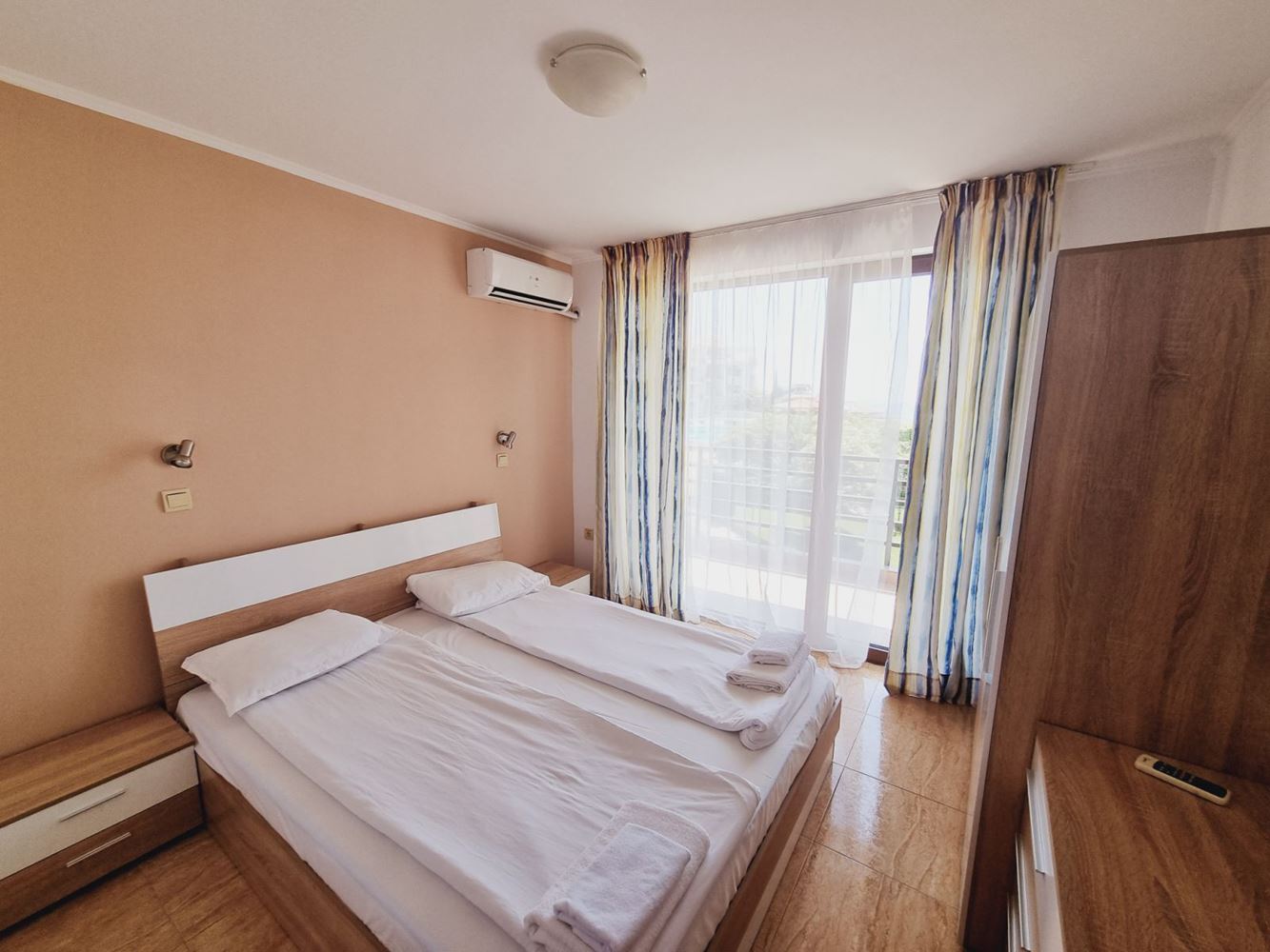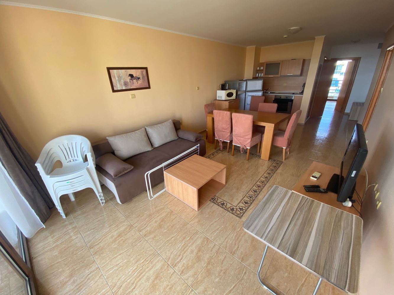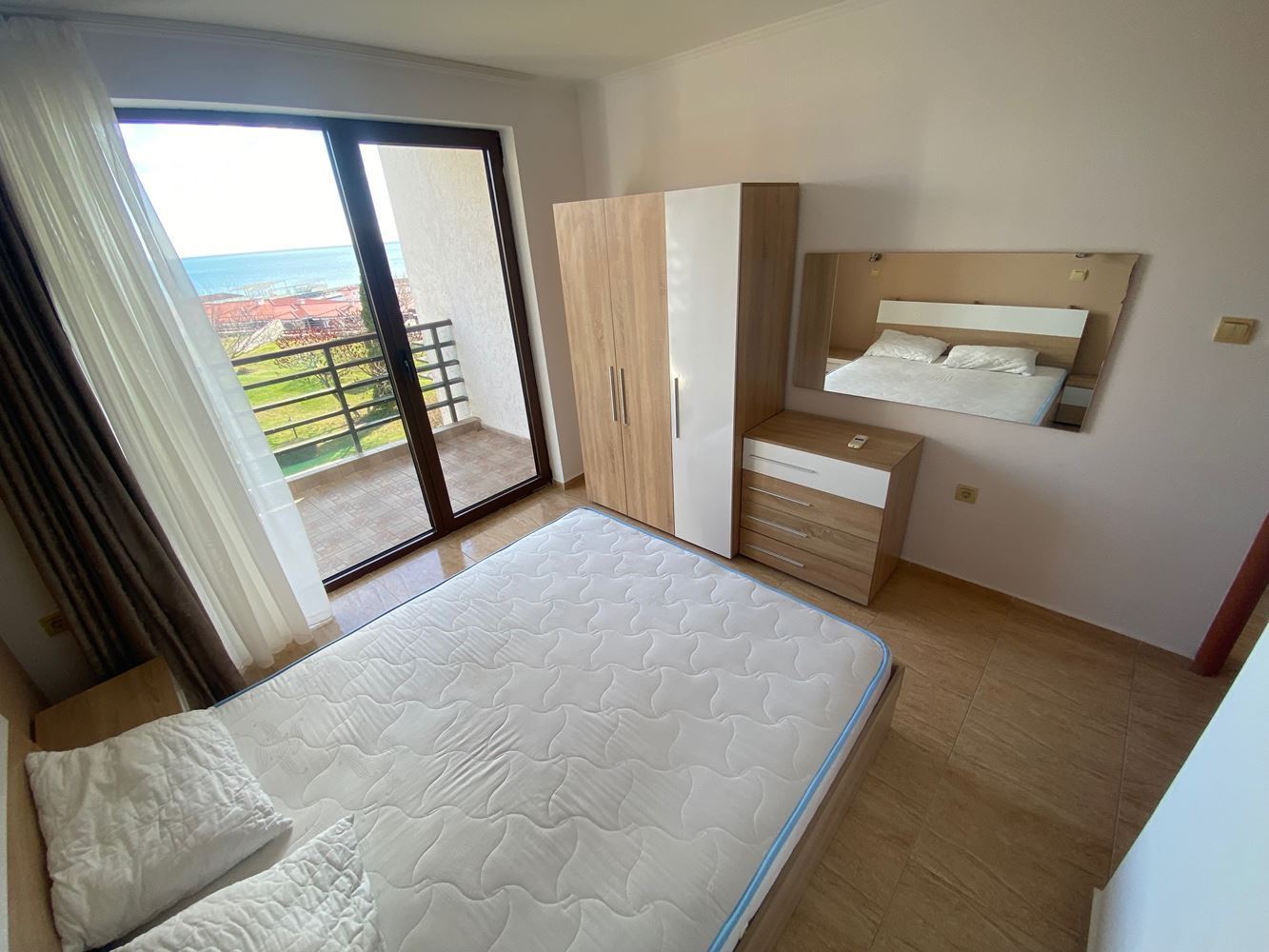Two-bedroom first line apartament with sea view in a luxury complex in St. Vlas. The complex is located on the beachfront and is within walking distance of the spa centre, night club, shop, restaurant and theatre. Flat with an area of 95 m2 is located on the third floor. It is sold fully furnished. A beauty salon with solarium, karaoke, fitness centre, restaurant, outdoor pool, cafe, children swimming pool, bar, permanent security and maintenance, children playground. The flat has a good layout, including a hall with kitchen area, two bedrooms, two bathrooms and two balconies. Ideal for couples with children. The complex has two swimming pools, aqua bar, fitness room, internet room, beauty salon with sauna, hairdresser, supermarket, exchange office, piano bar, parking.