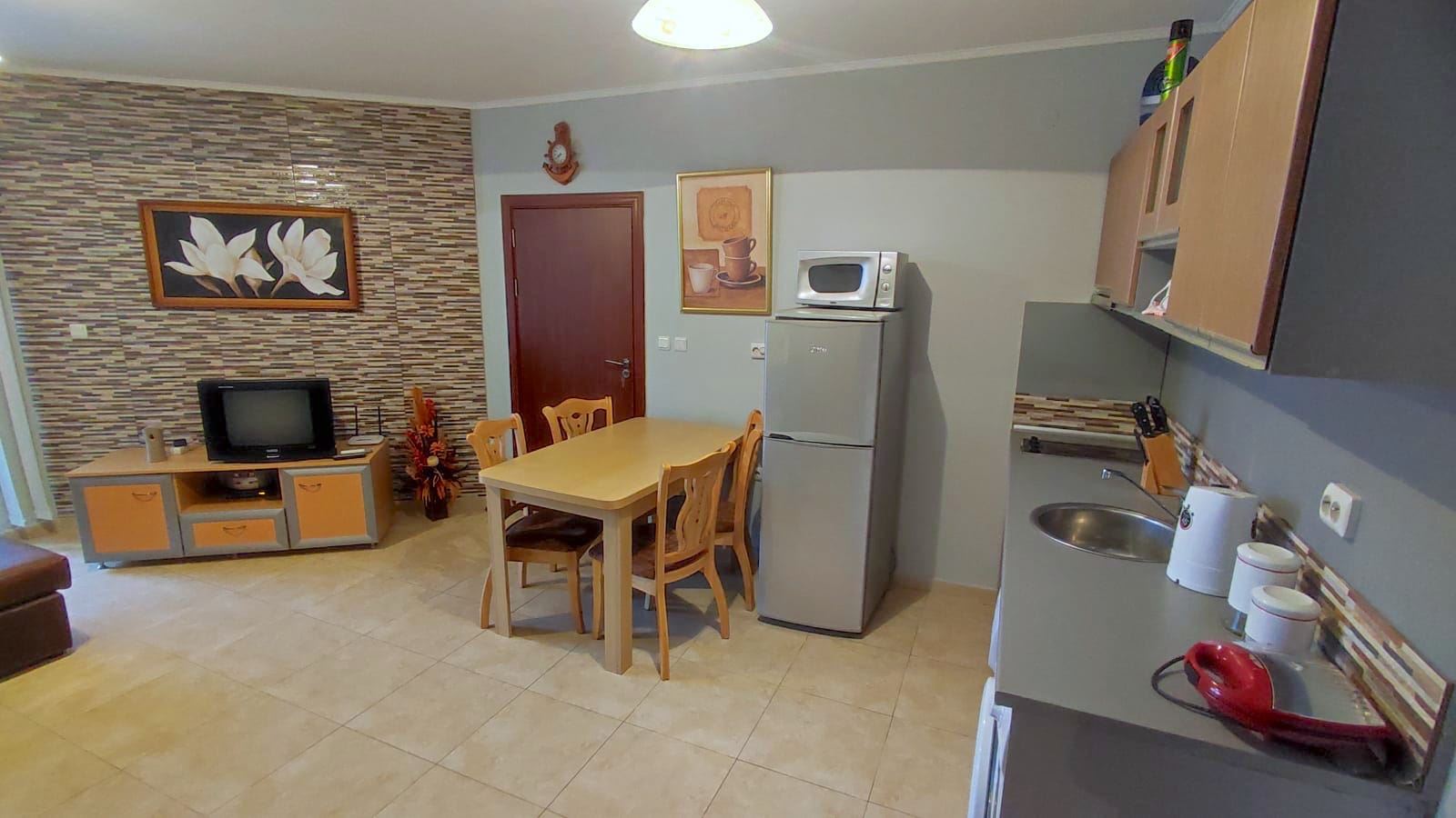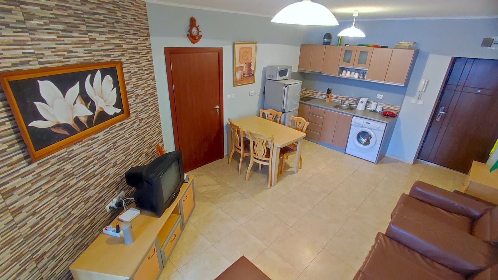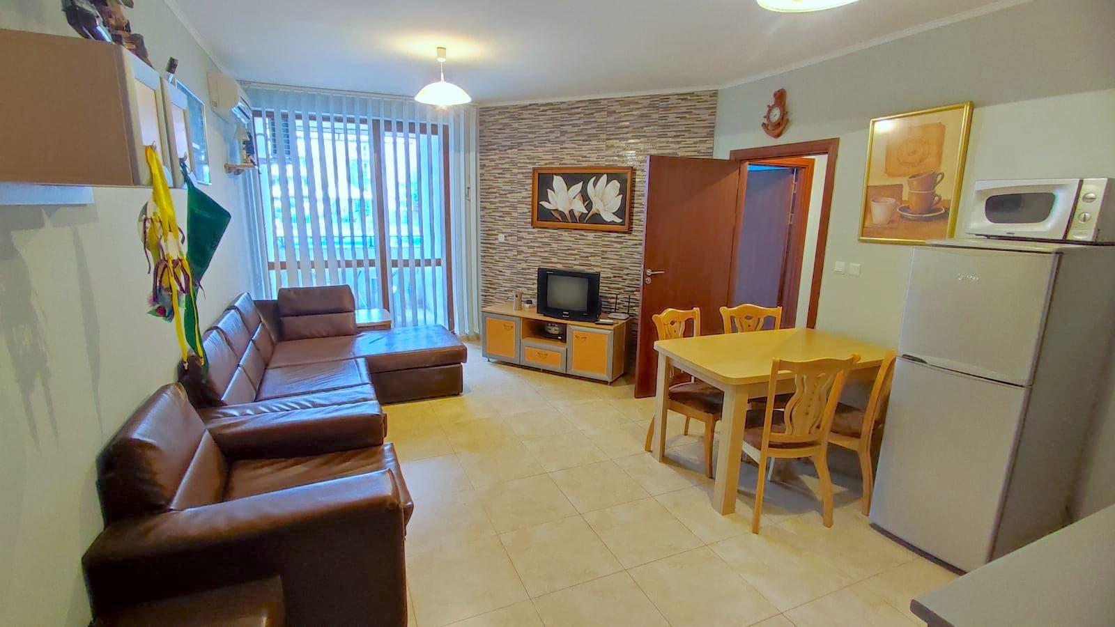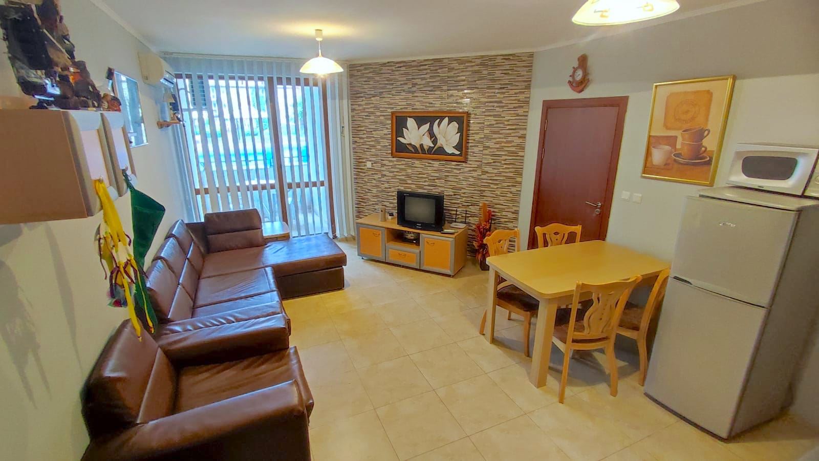 Two-bedroom large flat in a complex, which is located 200 metres from the sea and a good beach. Designed for both summer holidays and year-round residence. The complex consists of four floors and is part of a large mega complex with a common area, playgrounds, sports facilities, parking, restaurants, recreation and relaxation areas, SPA centre, fitness, grocery shop. The flat we offer is located on the low ground floor and has an area of 80 m2. It consists of two bedrooms, a spacious living room with a kitchenette, two bathrooms with WC and a terrace overlooking the pool and the inner complex. The flat is in good condition and ready to move in.