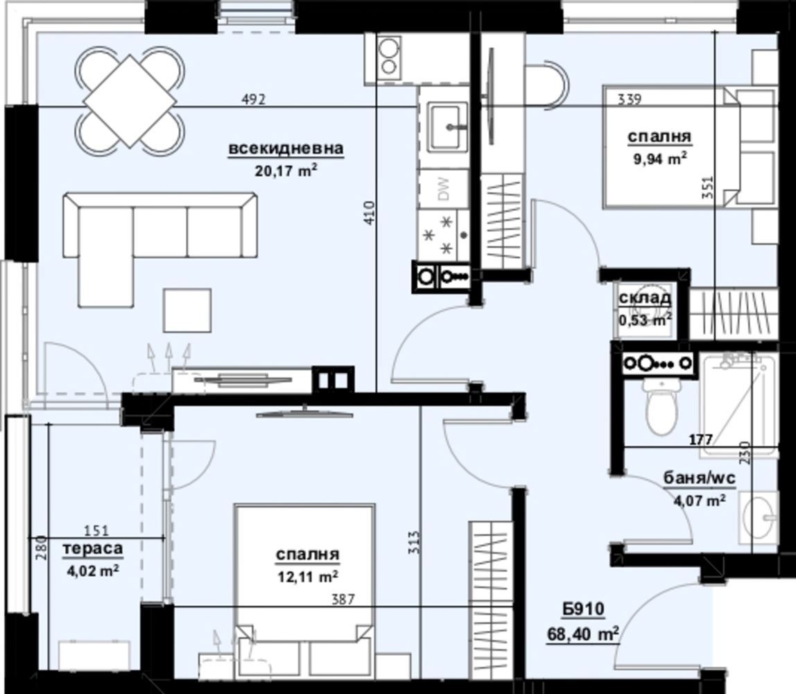 We offer you a two-bedroom modern apartment with a total area of 78.61 m2 on the ninth floor in a luxurious innovative new building in the Horizon district of Burgas. New Deluxe Residence, Fitness & Spa complex will upgrade the concept of quality living environment in the city, significantly raising the standard with a large dose of glamour and luxury. The building will impress with its elegant architectural design and prestigious contemporary look. The combination of composite ceramic slabs in white and graphite tones, brushed wood décor, metal and glass accents will give the exterior a very sophisticated look that will carry through to the interior thanks to the impressively executed common areas.