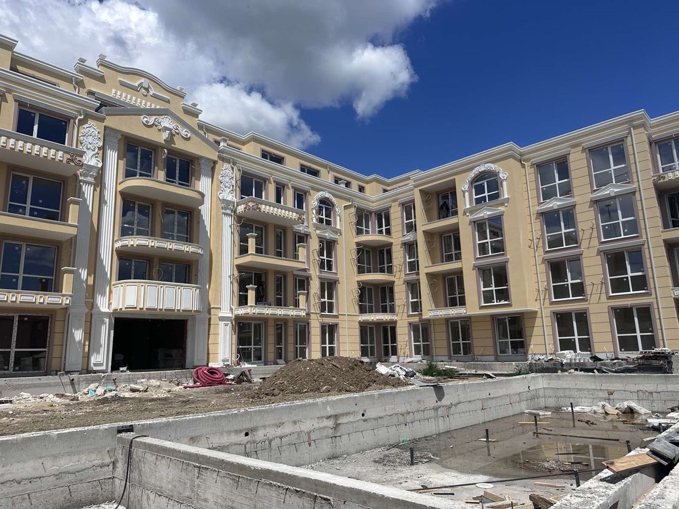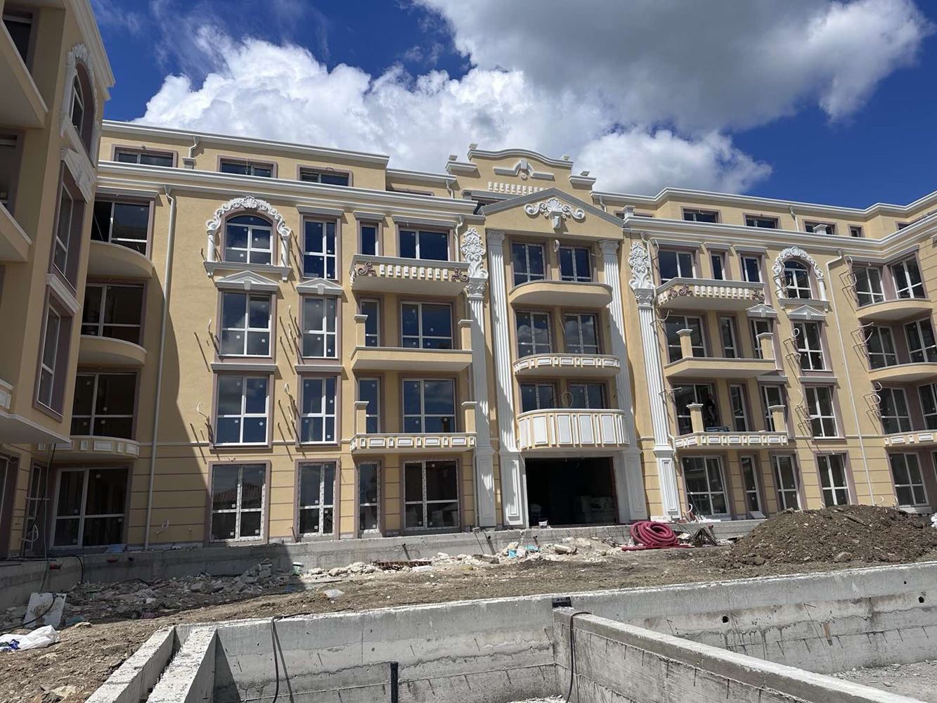 The complex consists of two buildings - A and B, and offers a variety of apartments, well-maintained common areas, swimming pool and peaceful environment close to the sea and the center of Ravda. A large area will create a wonderful recreation area for the residents with a swimming pool and paths landscaped by a landscape designer. The territory is decorated with elegant pergolas, rotundas, gazebos, walking paths flanked by elegant lanterns. The grounds are fully fenced. The complex is characterized by its impressive architectural appearance, impressive exterior, interior and the highest quality of construction and workmanship in every detail.