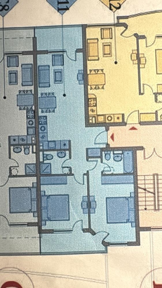 The apartment has an area of 98 m2 on the third of four floors and consists of a living room with kitchen, two bedrooms, two bathrooms, and two terraces. With two exposures. The apartment is fully furnished and equipped.