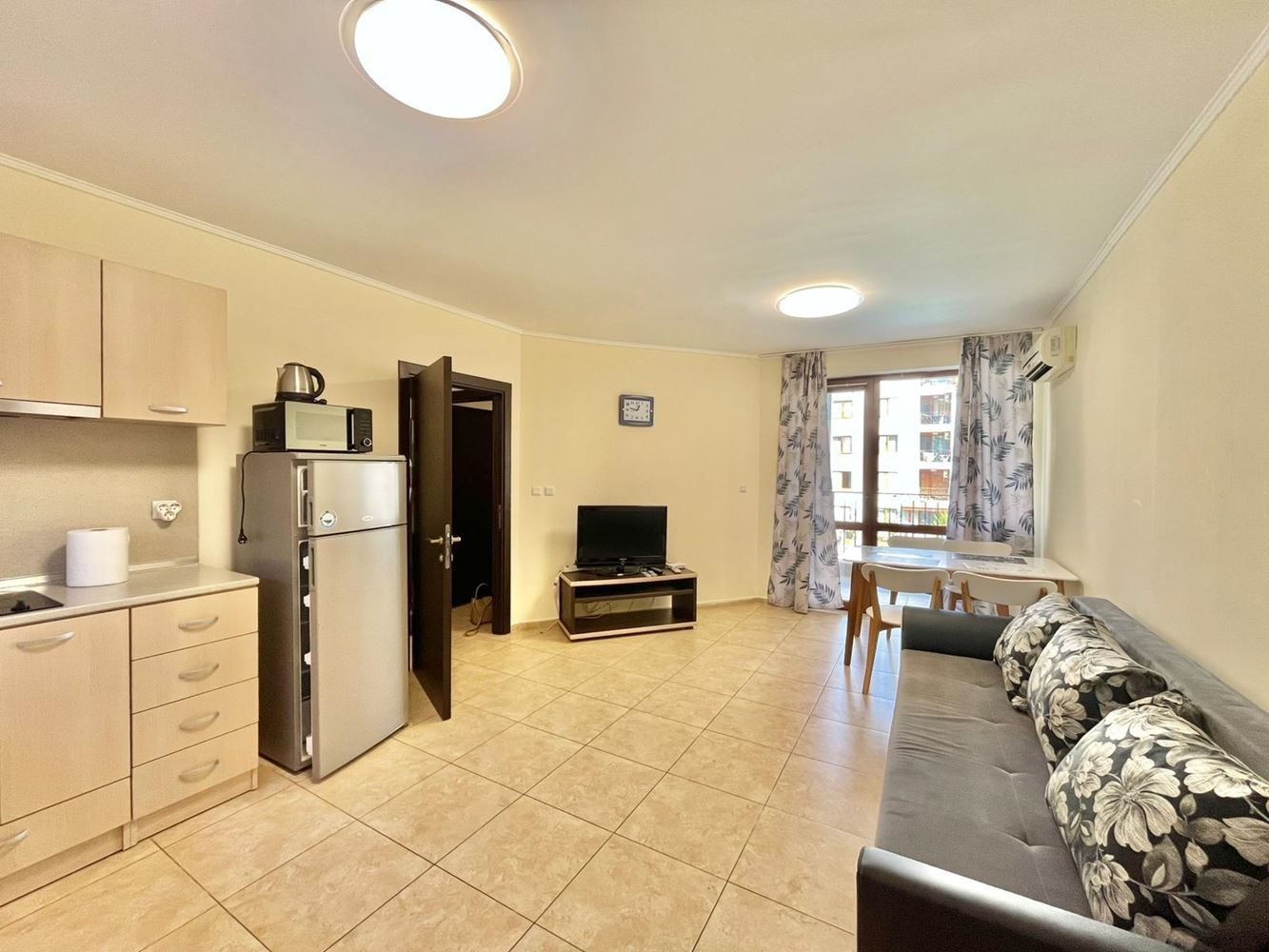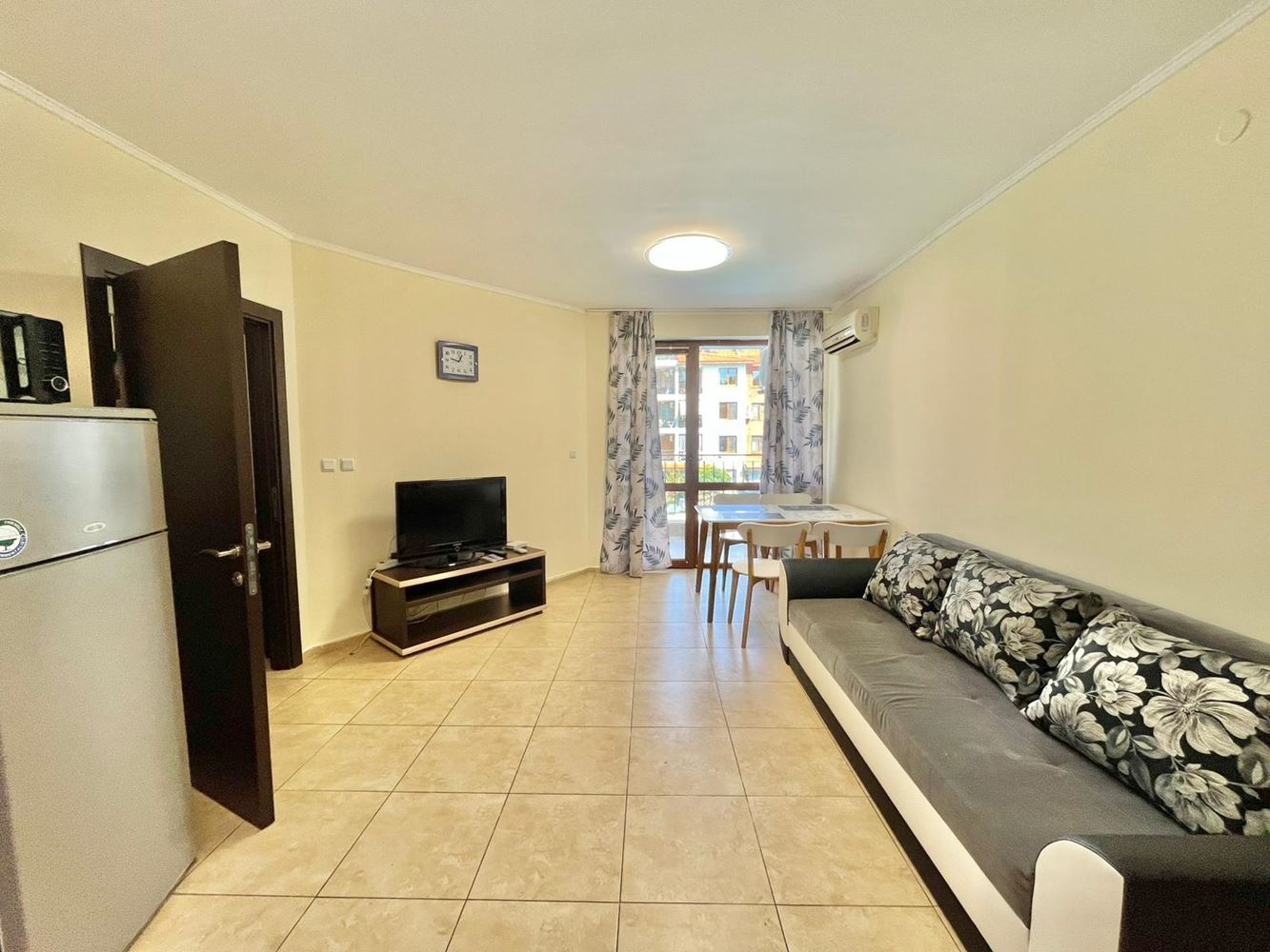 The apartment consists of a bright living room with space for a kitchenette and dining area, a separate bedroom, bathroom/WC, and a convenient balcony with a pleasant view of the pool – an ideal spot for morning coffee or evening relaxation. The functional layout and comfortable spaces create a sense of coziness and practicality for everyday living.