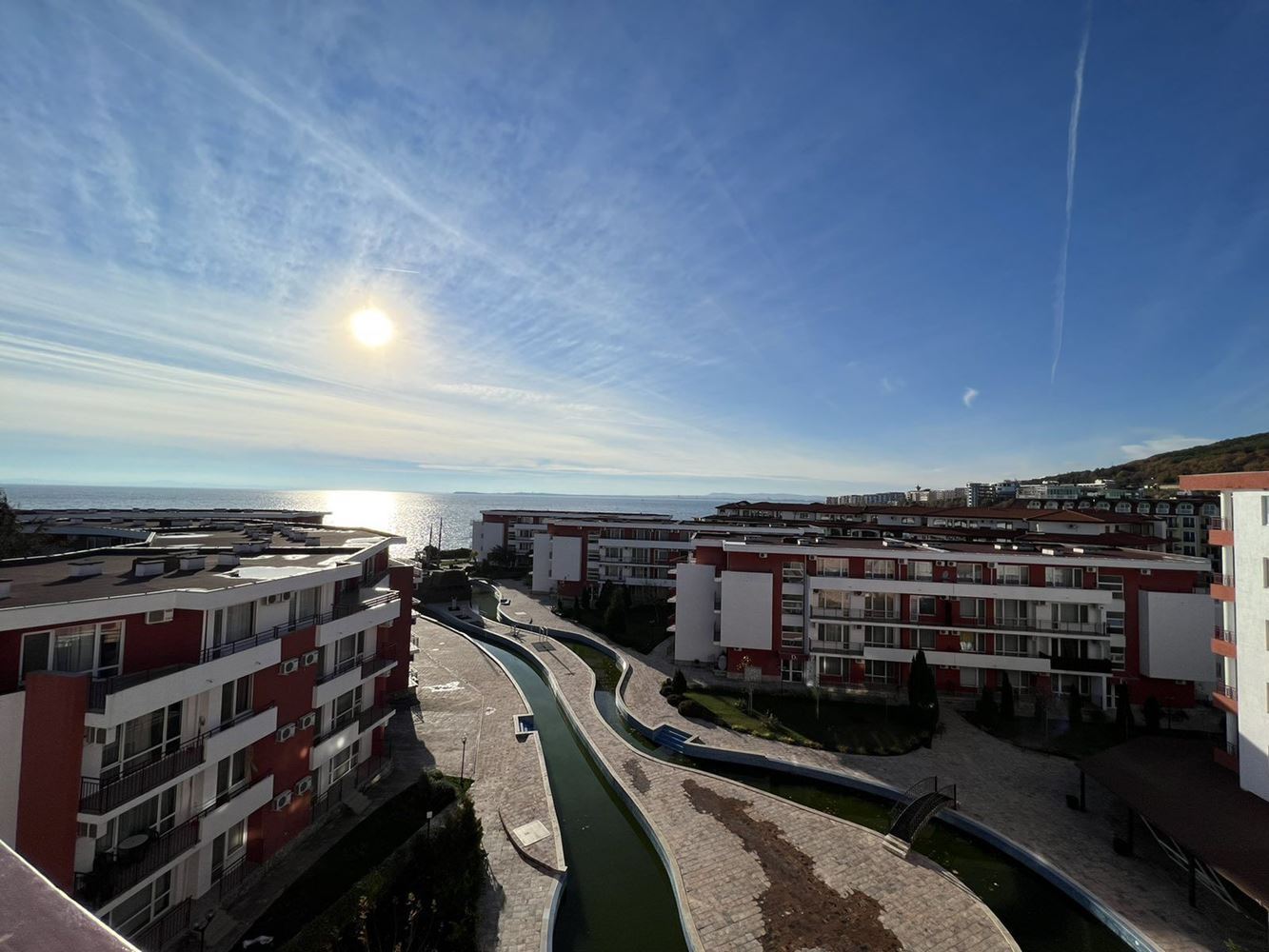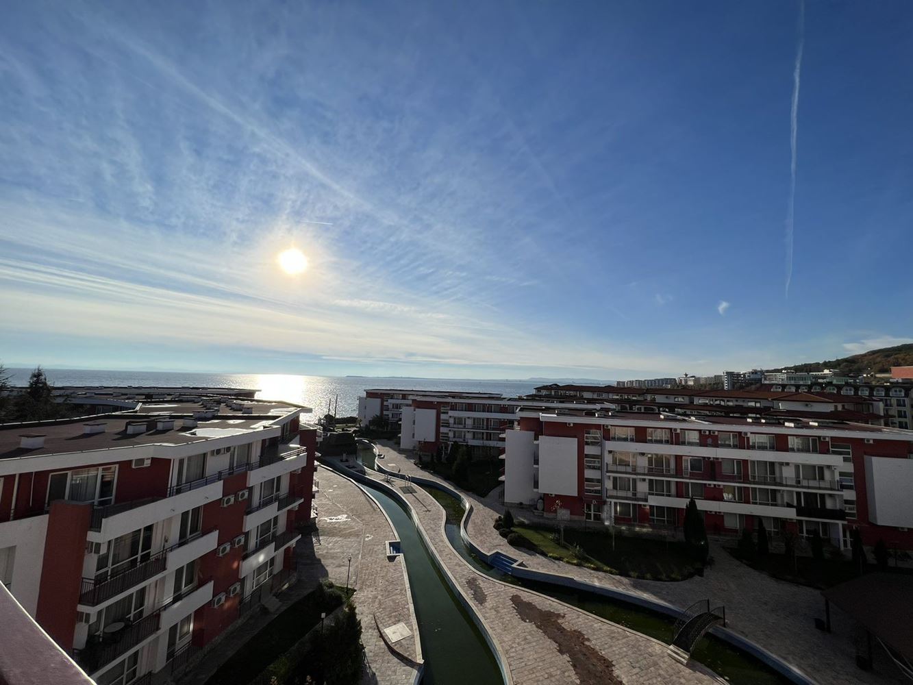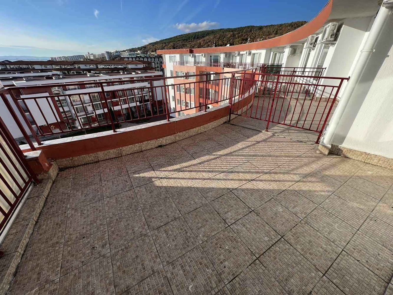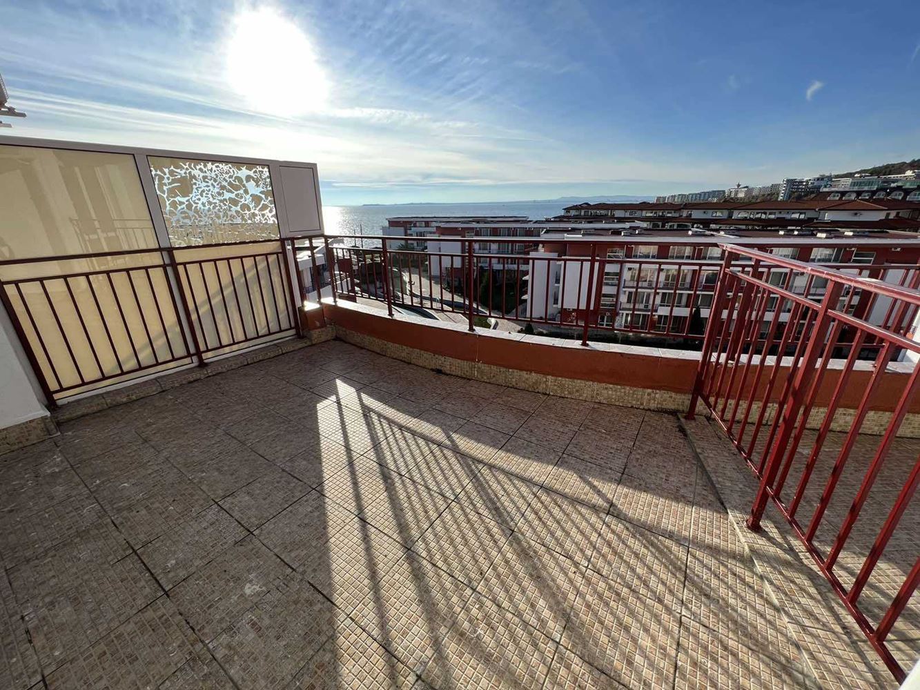 Two-bedroom penthouse with sea views in a lovely apartment complex located in a picturesque area in the elite resort of Elenite. In this location you can enjoy unique panoramic views of the sea, mountains and surrounding resorts. The complex has a large yard and its own sandy beach. This chic complex has swimming pools, four playgrounds with slides, fitness, sauna, beauty centre, massage parlour, supermarket, parking, security, restaurant bar, pizzeria, office, reception, parking and security all year round. The flat of 110 m2 is located on the fifth floor and comprises entrance hall, large living room with kitchen, two bedrooms, bathroom with WC, WC, storeroom and spacious balcony with view to the mountains and the sea. The flat is fully furnished.