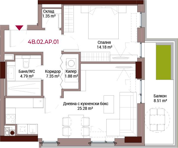 We present a two-room apartment with a total area of 98.31 m² on the second floor of a multifunctional complex with residential and commercial spaces, located in one of the most desirable and well-connected areas of Sofia – Lozenets. The complex is just 170 meters from the “Vitosha” metro station and in close proximity to Paradise Center, South Park, Hunting Park, the Zoo, elite schools, hospitals, and a wide range of services.