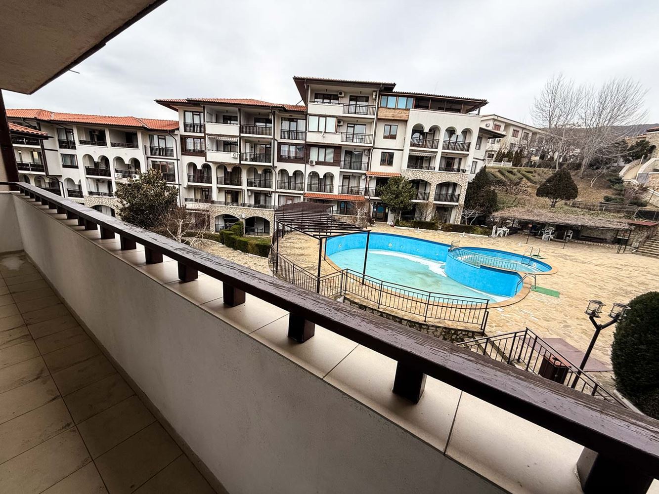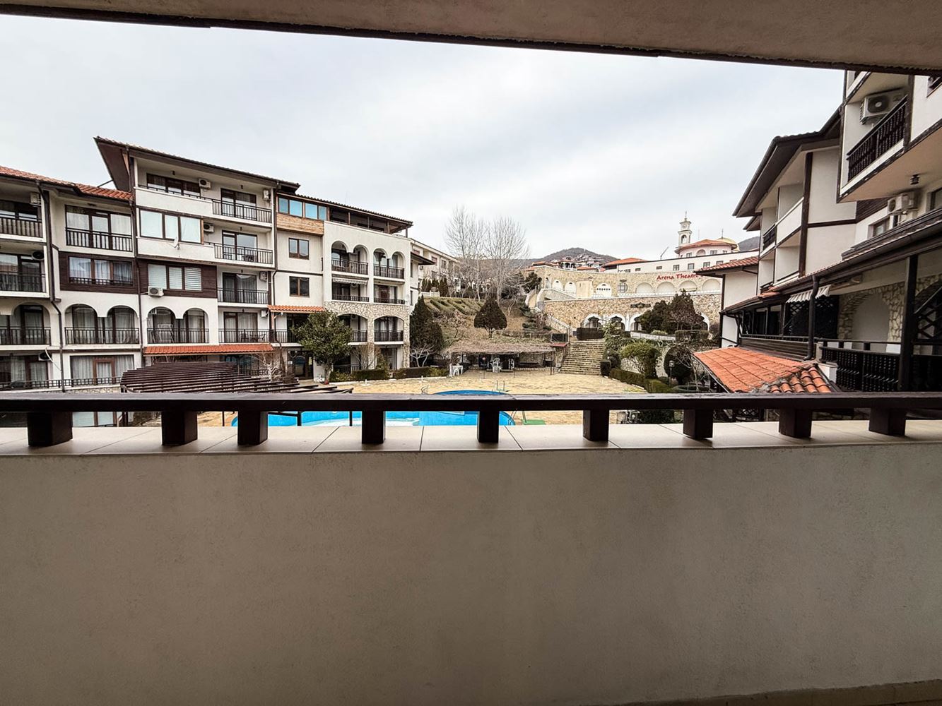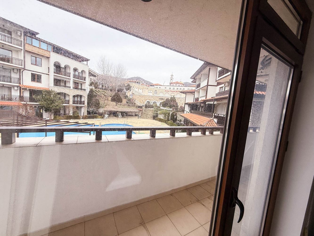 The apartment consists of a cozy living room with a kitchenette, a bedroom, a bathroom with a toilet, and a terrace, from which a pleasant view opens towards the pool and the green areas of the complex. The space is organized practically, and the natural light contributes to the feeling of spaciousness and tranquility. The property is sold fully furnished, which allows immediate use without the need for additional expenses.