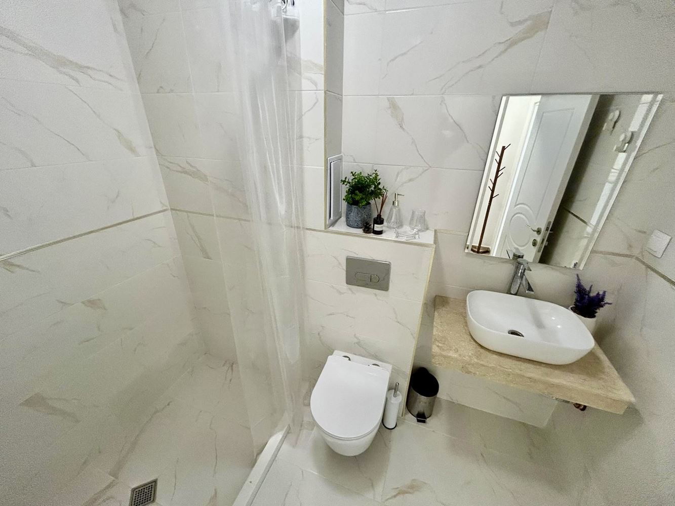 The apartment features a functional layout: entrance hall, bright living room with kitchenette and dining area, cozy bedroom, elegant bathroom with toilet, and a spacious balcony overlooking the pool. The interior is carefully designed with modern lines and a fresh, relaxing atmosphere. Everything in the apartment is brand new – furniture, appliances, and the building itself – ensuring maximum comfort and peace of mind from day one. The property is move-in ready and requires no additional investment.