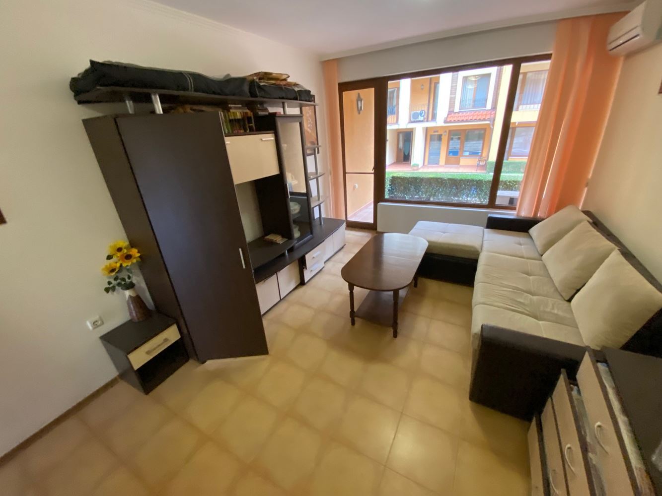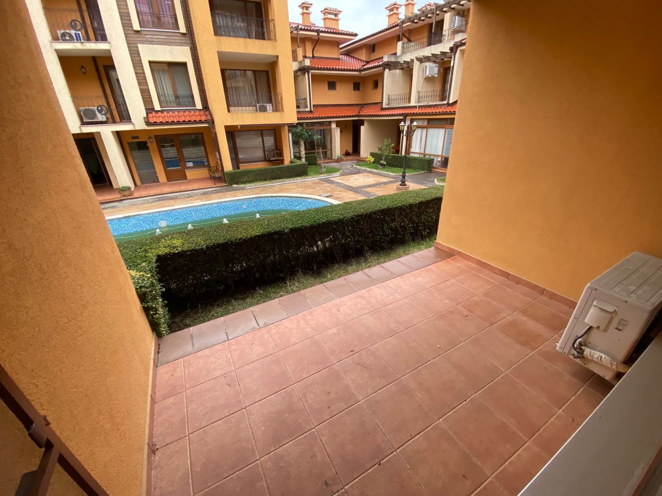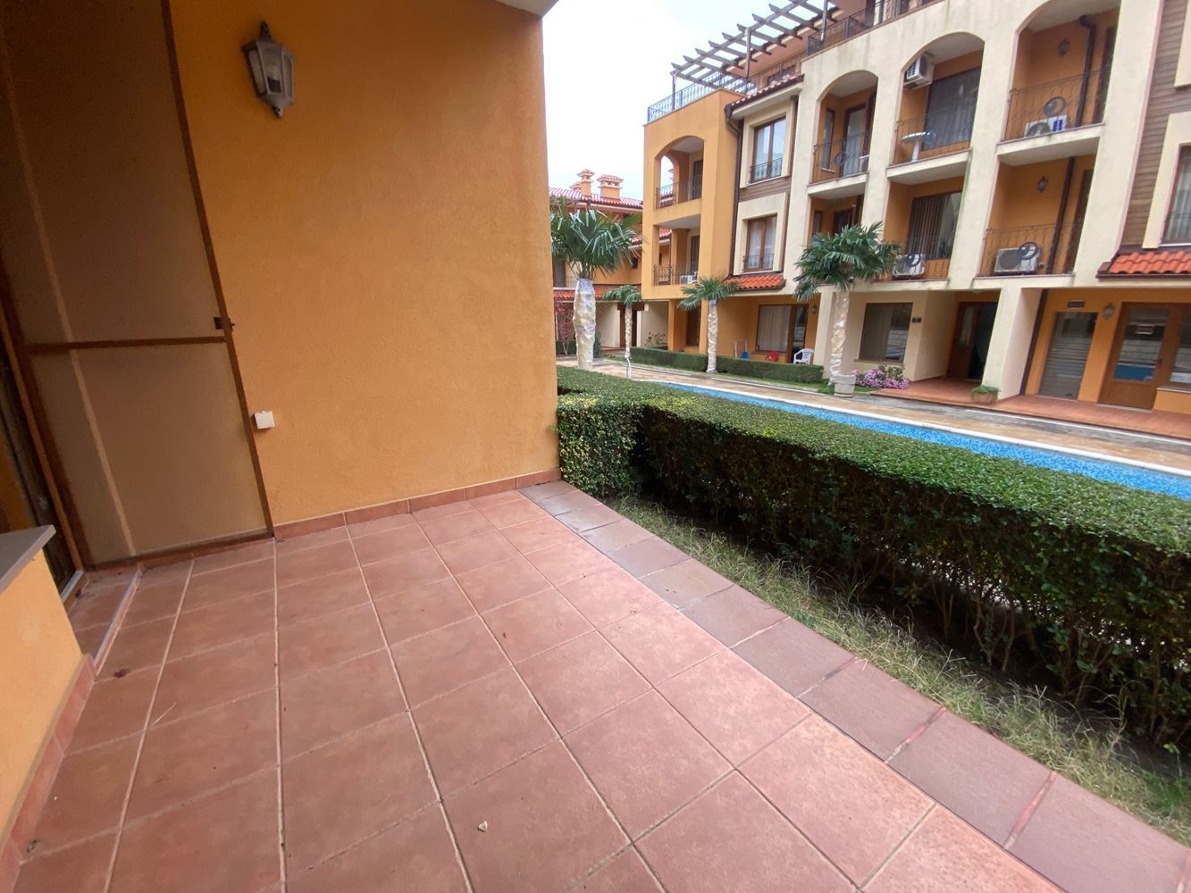 One bedroom unique apartament overlooking the swimming pool in a comfortable residential complex located in the picturesque part of the resort Sveti Vlas. Sandy beaches are at a distance of 500 m from the complex.The territory of the complex is protected, landscaped and greened. There is a swimming pool, recreation areas, a playground for children and a car park. The offered apartment is located on the ground floor and consists of a living room with a fully equipped kitchen, a bedroom, a bathroom with WC and a veranda with access to the adjacent private patio. The beautifully appointed and incredibly cosy complex is ideal for year-round living and seasonal holidays. The property has an outdoor swimming pool, car parking and an equipped barbecue area. Within walking distance to many local amenities, several beaches, yacht harbour and much more.