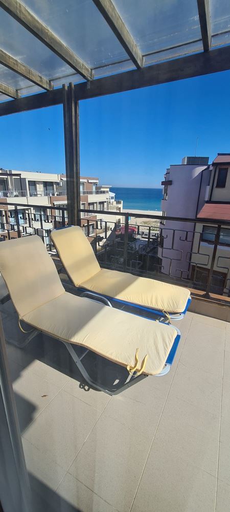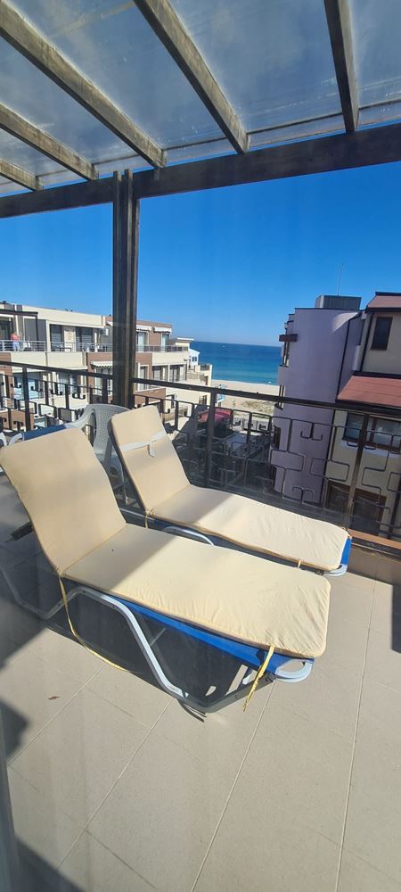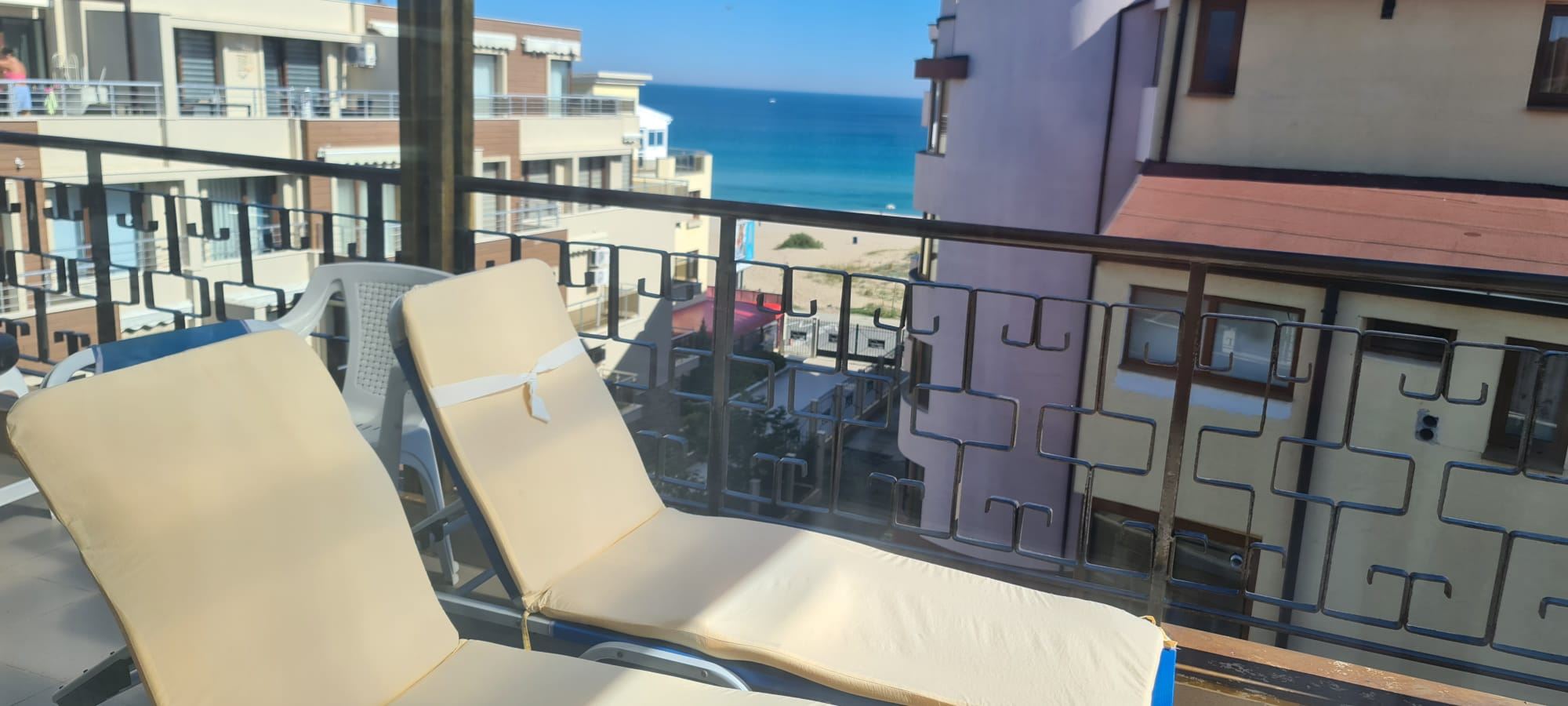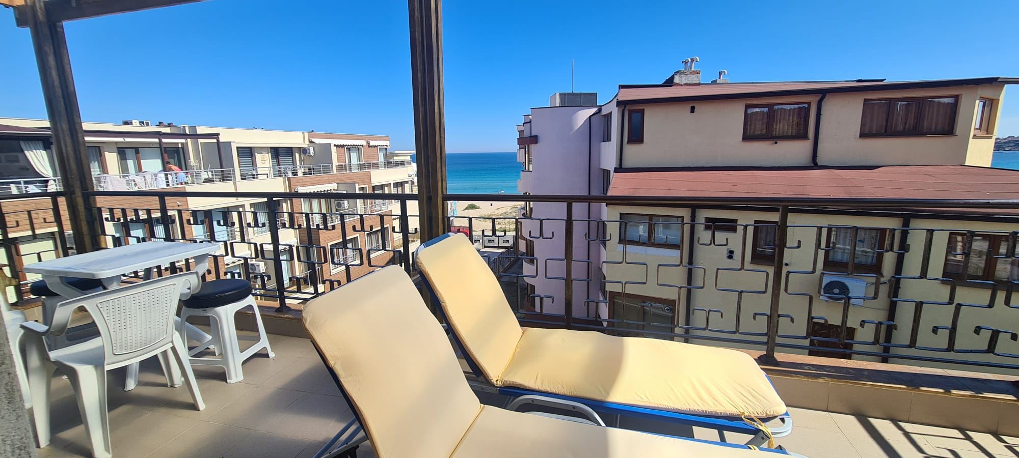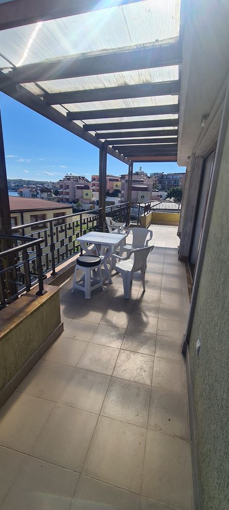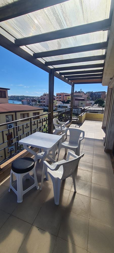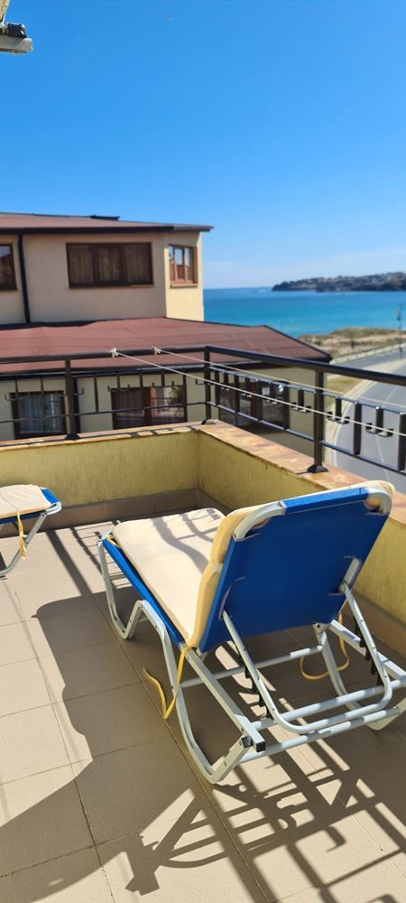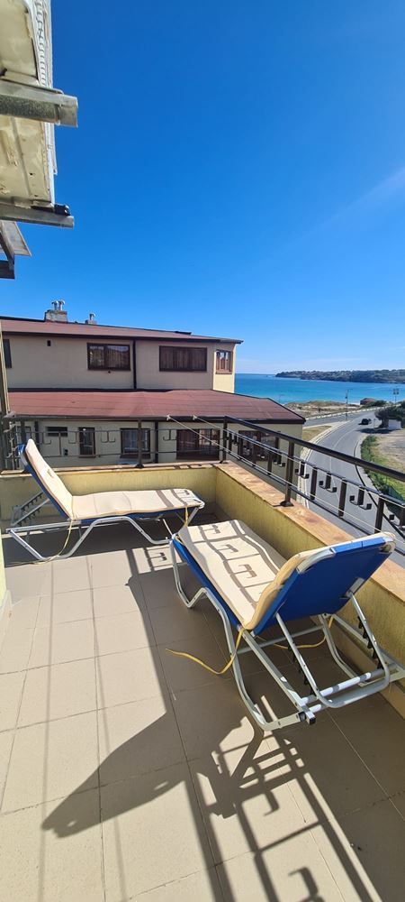 Unique panoramic one bedroom apartament on the top floor of a detached residential building in Sozopol with stunning sea and beach views. The building is located next to Harmani beach, the most favoured area in the new part of Sozopol, with easy year-round access. Convenient location, just 50 metres from the main street and 100 metres from Harmani beach. Pedestrian accessibility to all infrastructure. The area is suitable for all year round living, everything is one step away: supermarkets, cafes, restaurants, shops, clubs, pharmacies, banks. There are no service charges. The apartament is located on the fifth floor, northern exposure. The total area is 82 m2 of which 42 m2 is the apartament and 40 m2 is the terrace. The layout comprises a living room with fitted kitchenette, a separate bedroom and a long terrace with sea views. The bedroom and living room have access to the terrace. The building has no lift. The apartament is suitable for permanent residence. Excellent option for renting, as it is located in walking distance to the beach.
