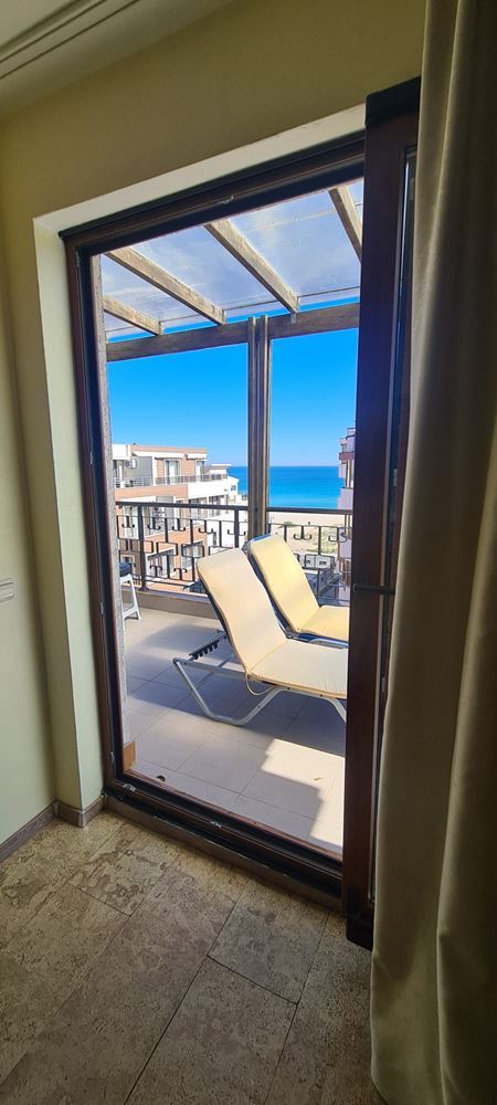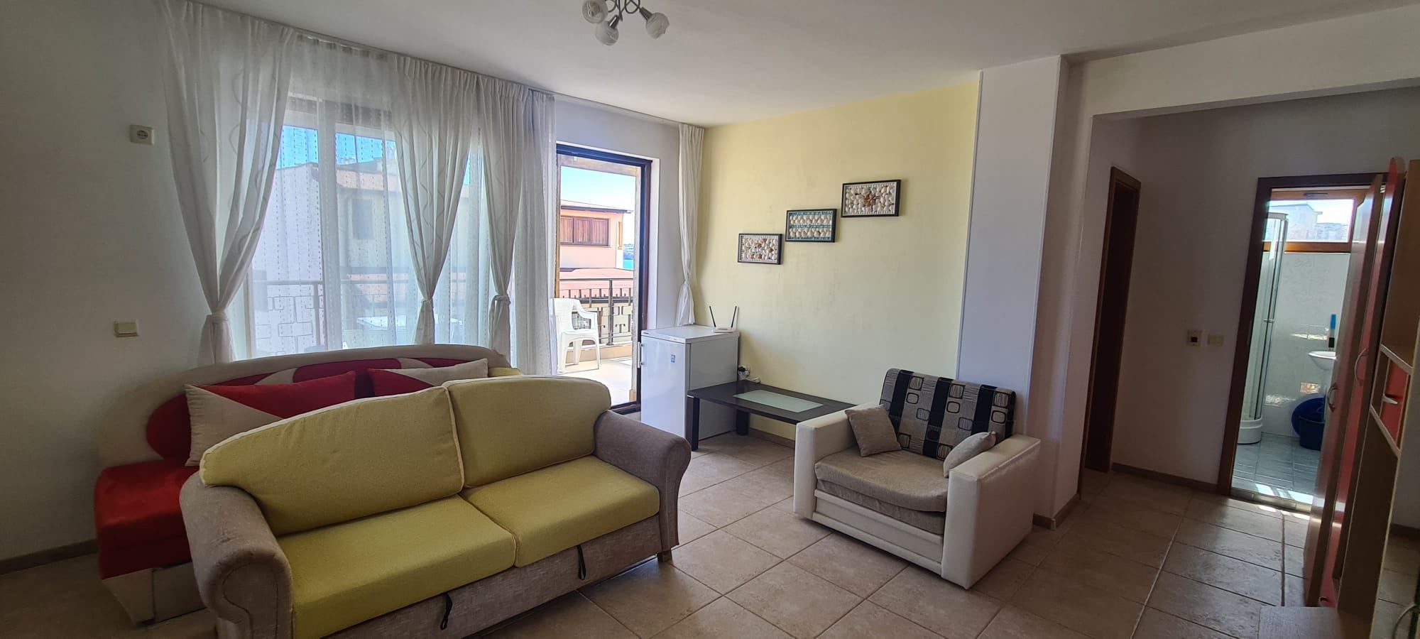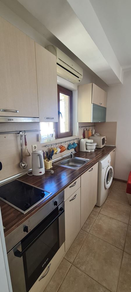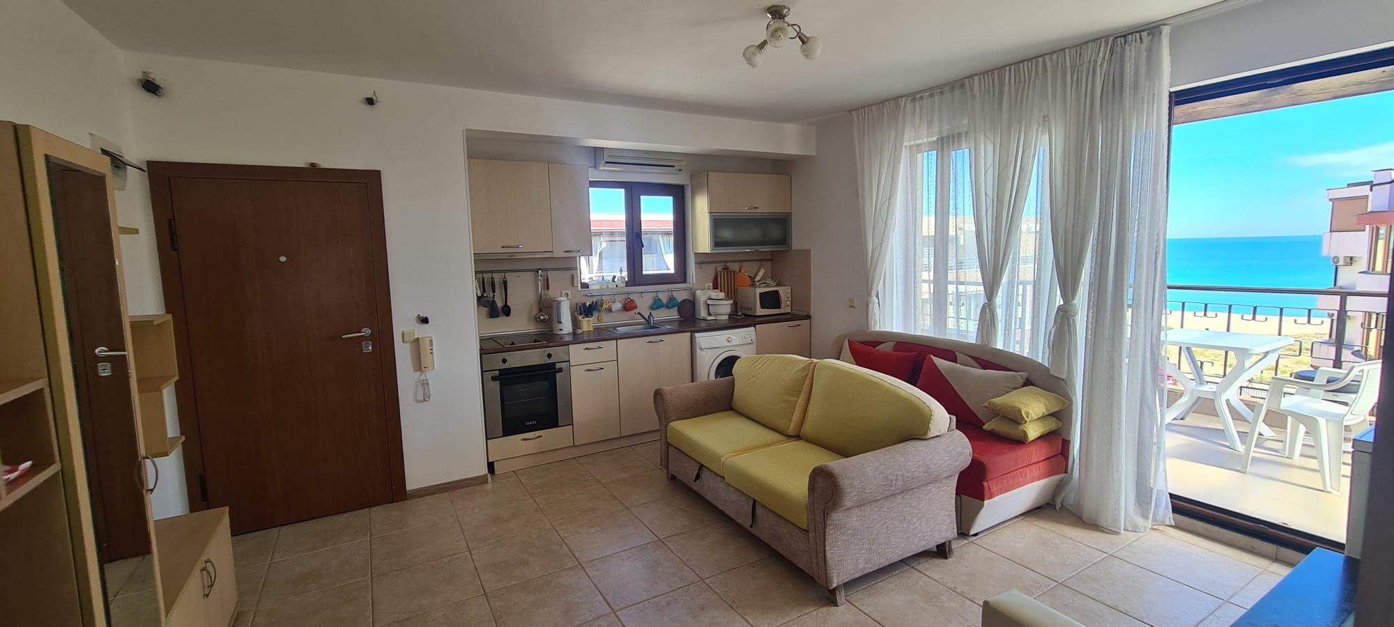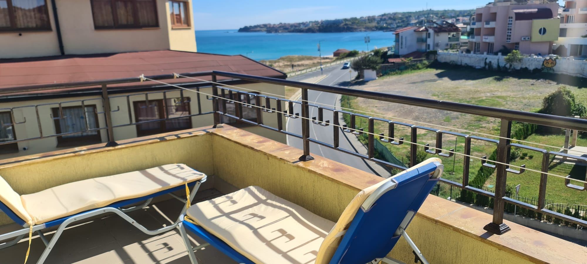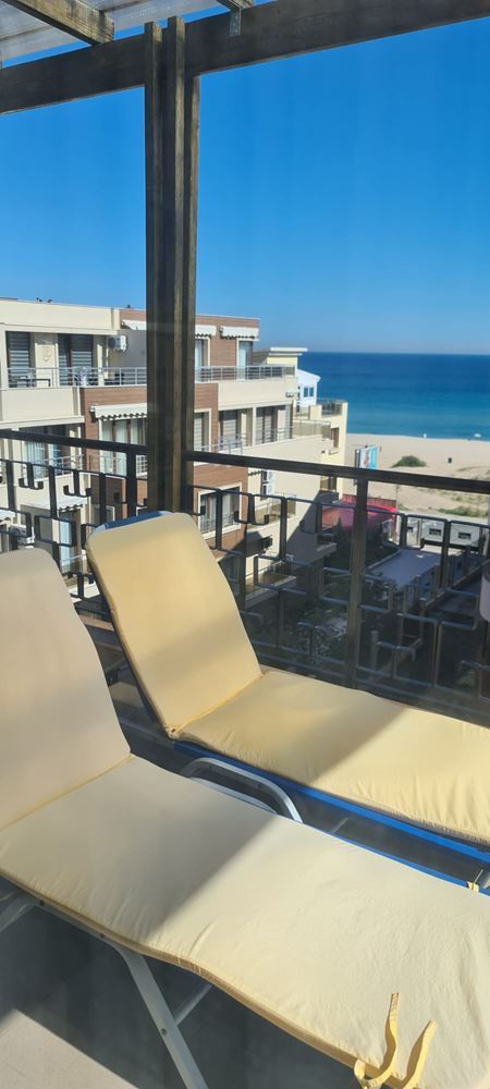 Unique panoramic one bedroom apartament on the top floor of a detached residential building in Sozopol with stunning sea and beach views. The building is located next to Harmani beach, the most favoured area in the new part of Sozopol, with easy year-round access. Convenient location, just 50 metres from the main street and 100 metres from Harmani beach. Pedestrian accessibility to all infrastructure. The area is suitable for all year round living, everything is one step away: supermarkets, cafes, restaurants, shops, clubs, pharmacies, banks. There are no service charges. The apartament is located on the fifth floor, northern exposure. The total area is 82 m2 of which 42 m2 is the apartament and 40 m2 is the terrace. The layout comprises a living room with fitted kitchenette, a separate bedroom and a long terrace with sea views. The bedroom and living room have access to the terrace. The building has no lift. The apartament is suitable for permanent residence. Excellent option for renting, as it is located in walking distance to the beach.