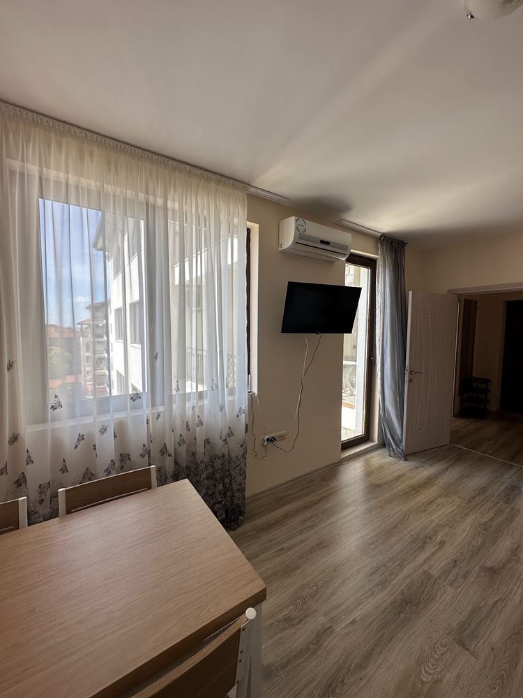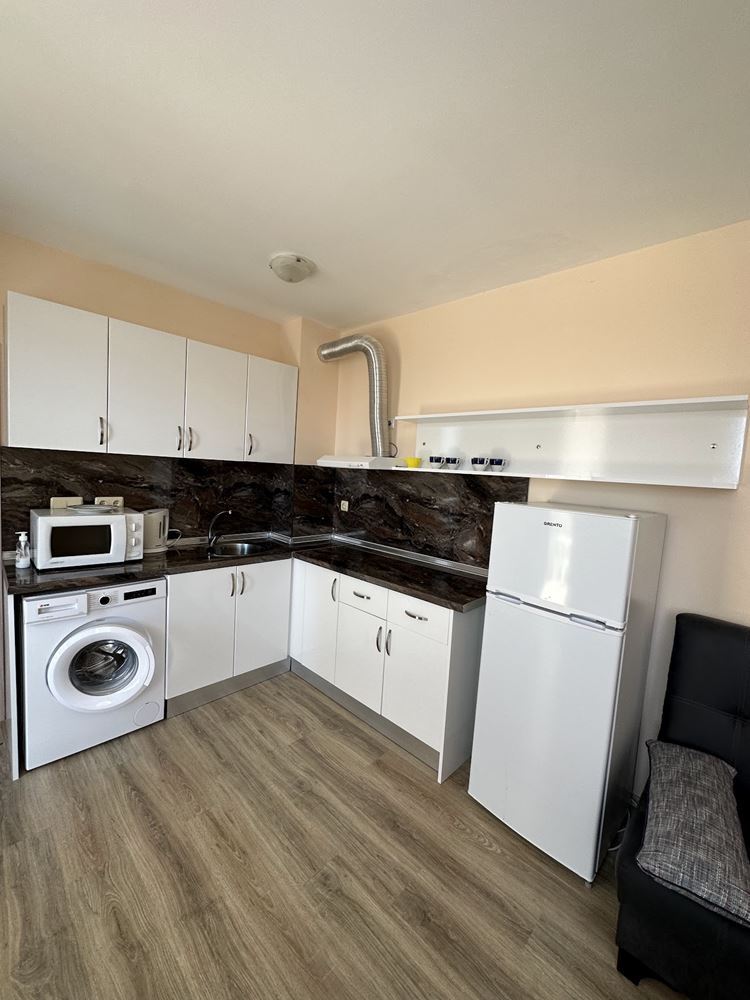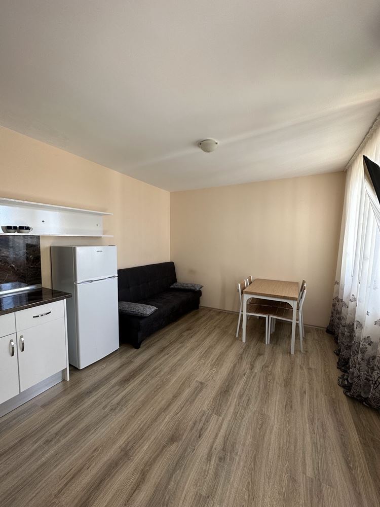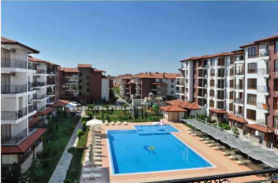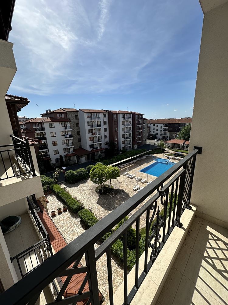 Wonderful one bedroom apartment overlooking the pool in Nessebar, in a stunningly beautiful complex, located 300 meters from the beach and 300 meters from the Aqua Park. The complex consists of six-storey buildings, each of which has its own swimming pool with children's area and children's playgrounds. At the disposal of owners and guests there is a restaurant, cafe, mini-market, small spa center, tennis courts, playground, free parking. The complex is guarded all year round. The apartment of 55 m2 is located on the fifth floor. The apartment has an entrance hall, a living room with kitchen part, a bedroom, a bathroom with WC and a balcony. It is sold fully furnished and equipped.